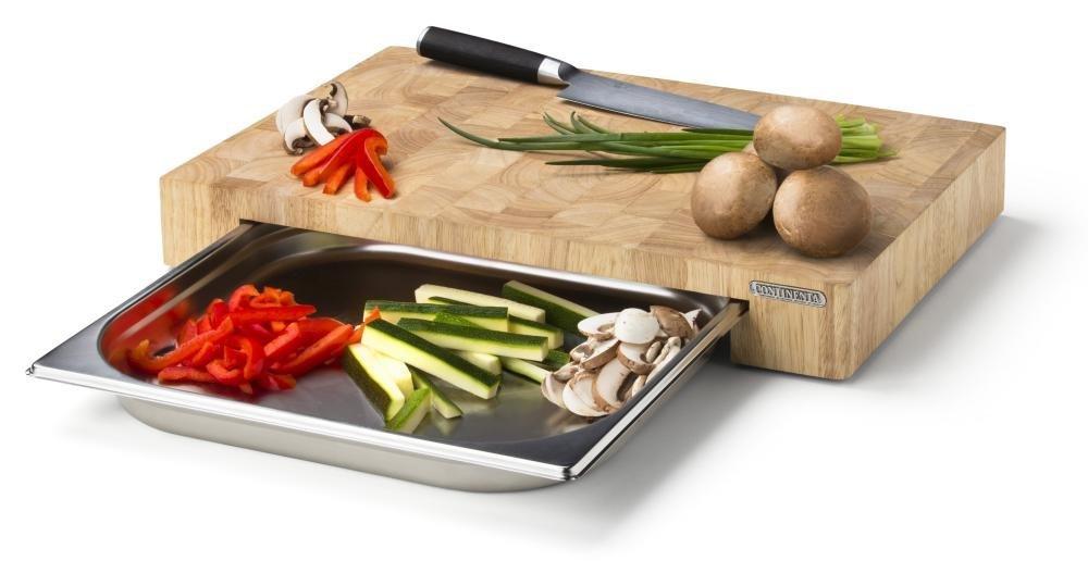 Das große Continenta Stirnholz Schneidbrett mit Edelstahl Auffangschale ist besonders praktisch, Abfallreste werden über die Auffangschale entsorgt und stören nicht auf dem Schneidbrett.