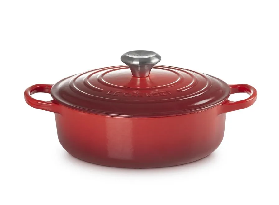 Das farbig emaillierte Le-Creuset-Kochgeschirr eignet sich zum Servieren am Tisch. Es passt sowohl zu einer festlich gedeckten Tafel als auch auf den normalen Küchentisch. Ein Vorteil des schweren Gusseisens von Le Creuset ist die gute Wärmespeicherung des Kochgeschirres.