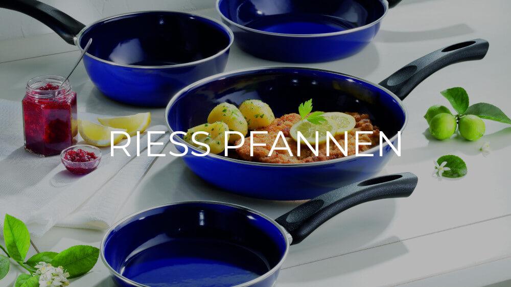 Die Pfannenauswahl von Riess ist vielfältig. Die beliebteste Riess-Pfanne ist die Schnitzelpfanne, gefolgt von der Schlemmerpfanne, Eierpfanne und Gourmetpfanne. Alle bestehen aus Emaille. Durch die unterschiedlichen Formen, Höhen und Griffe sind sie für verschiedene Einsatzzwecke ausgelegt. Sie können auf allen Herdarten, inklusive Induktion, verwendet werden. Pfannen mit Metallgriff sind außerdem backofenfest.