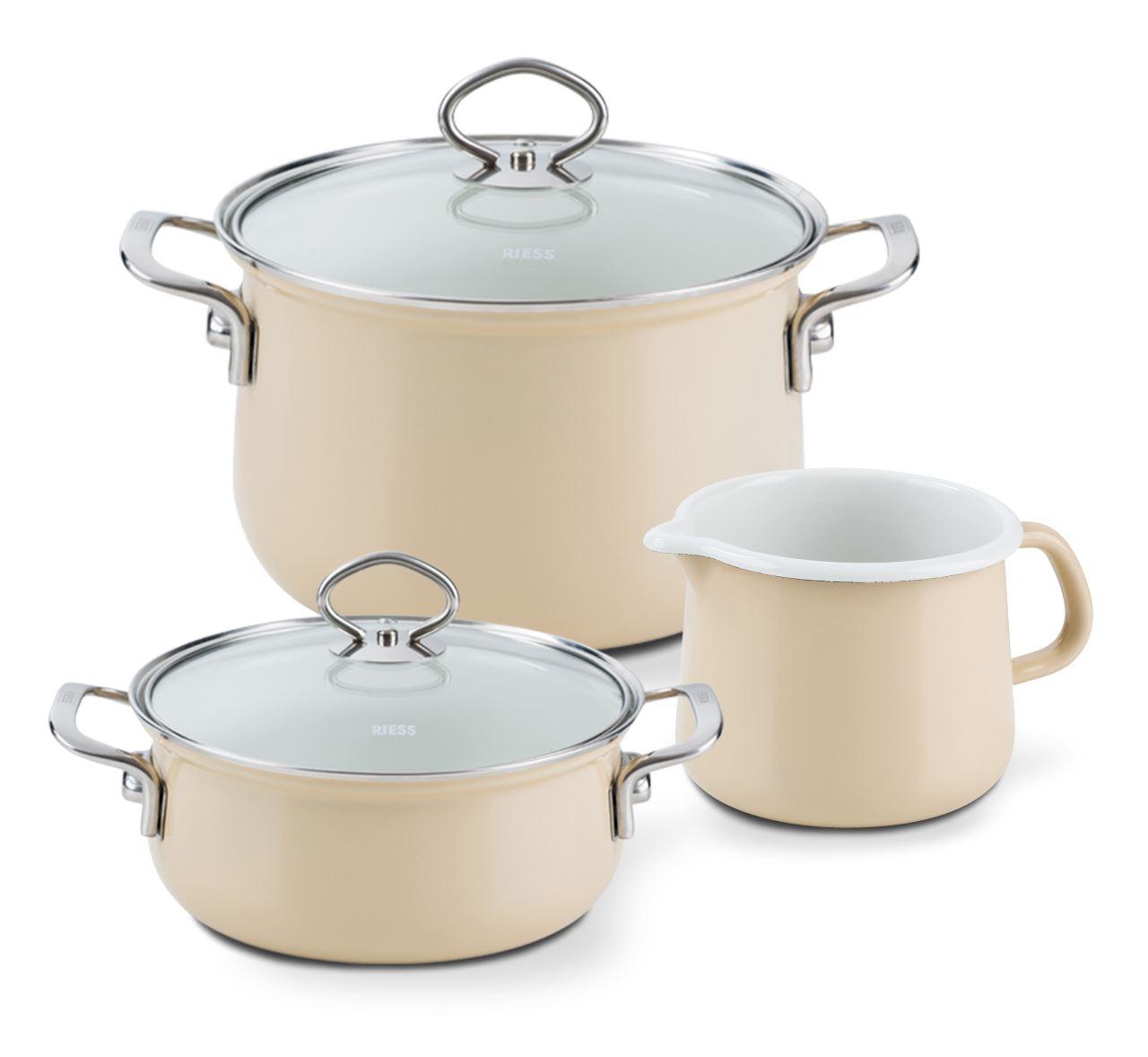 Angebots-Topfset bestehend aus 3 Qualitätstöpfen der Riess Emaille Serie Nouvelle zum günstigen Preis! Kochgeschirr aus Emaille ist bereits seit vielen Generationen bewährt und erfreut sich nach wie vor großer Beliebtheit. Zu diesem Set gehören ein hoher Kochtopf, ein flacher Bratentopf sowie ein Schnabeltopf.