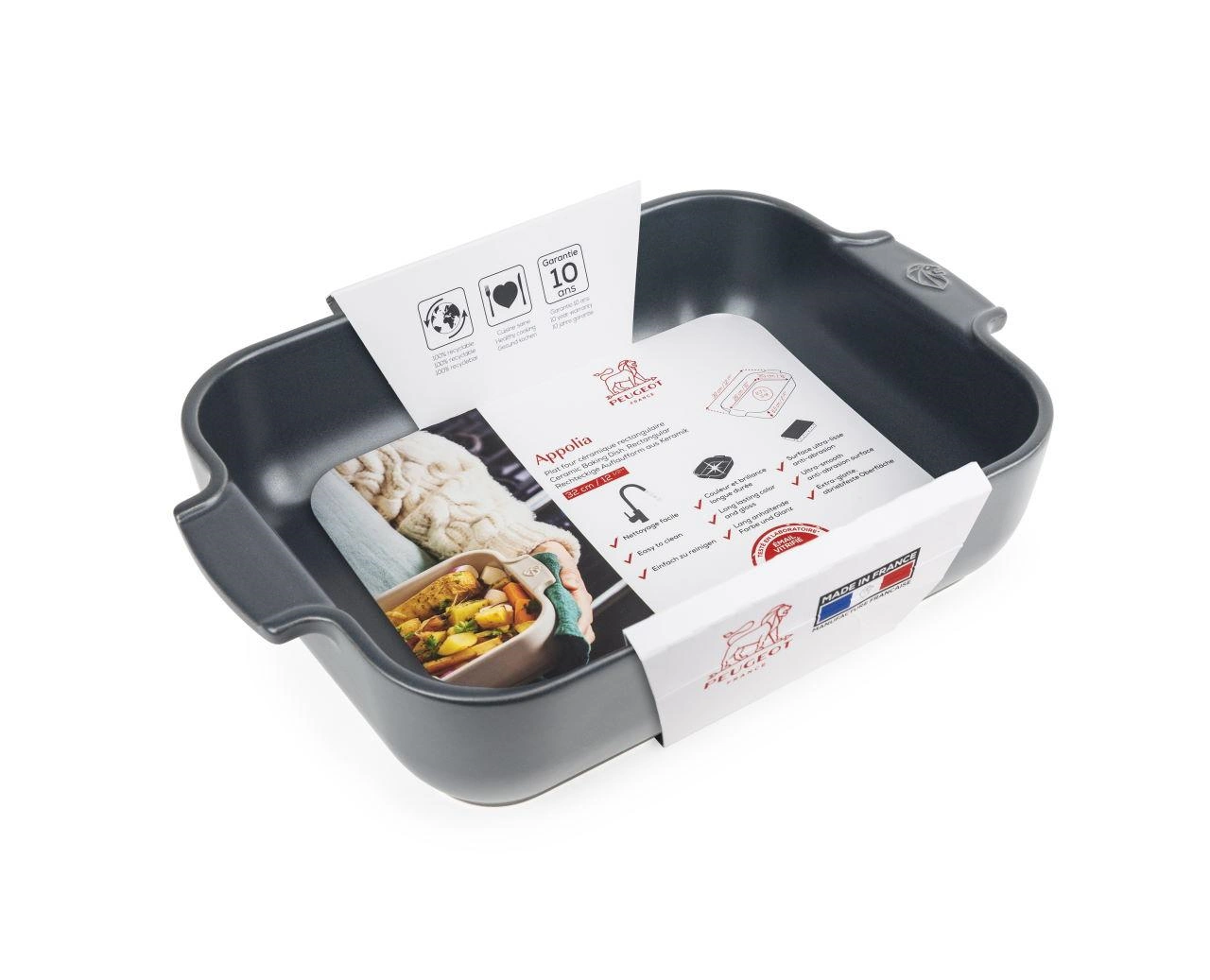 Die Peugeot Keramik Auflaufform besteht aus einem besonders hochwertigem Steinzeug, das bis 250 °C hitzefest und bis - 20 °C kältefest ist. Die Form ist backofenfest sowie mikrowellen- und spülmaschinengeeignet. Außerdem hat sie eine extra-glatte, abriebfeste Oberfläche. Die Form ist in 2 Größen erhältlich. Dank ihrer ausgeprägten, seitlichen Griffe mit dem typischen Peugeot Logo lässt sie sich leicht handhaben.