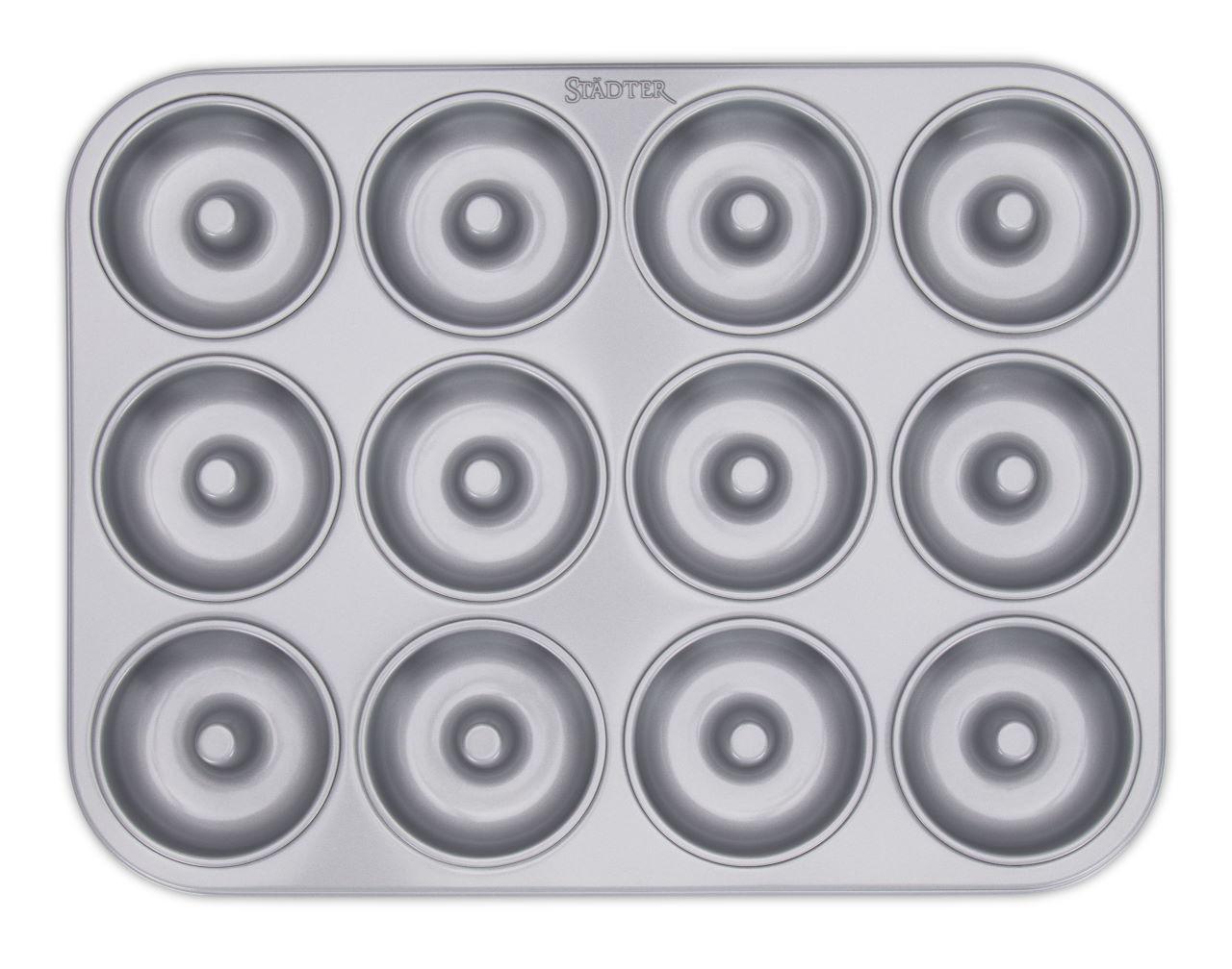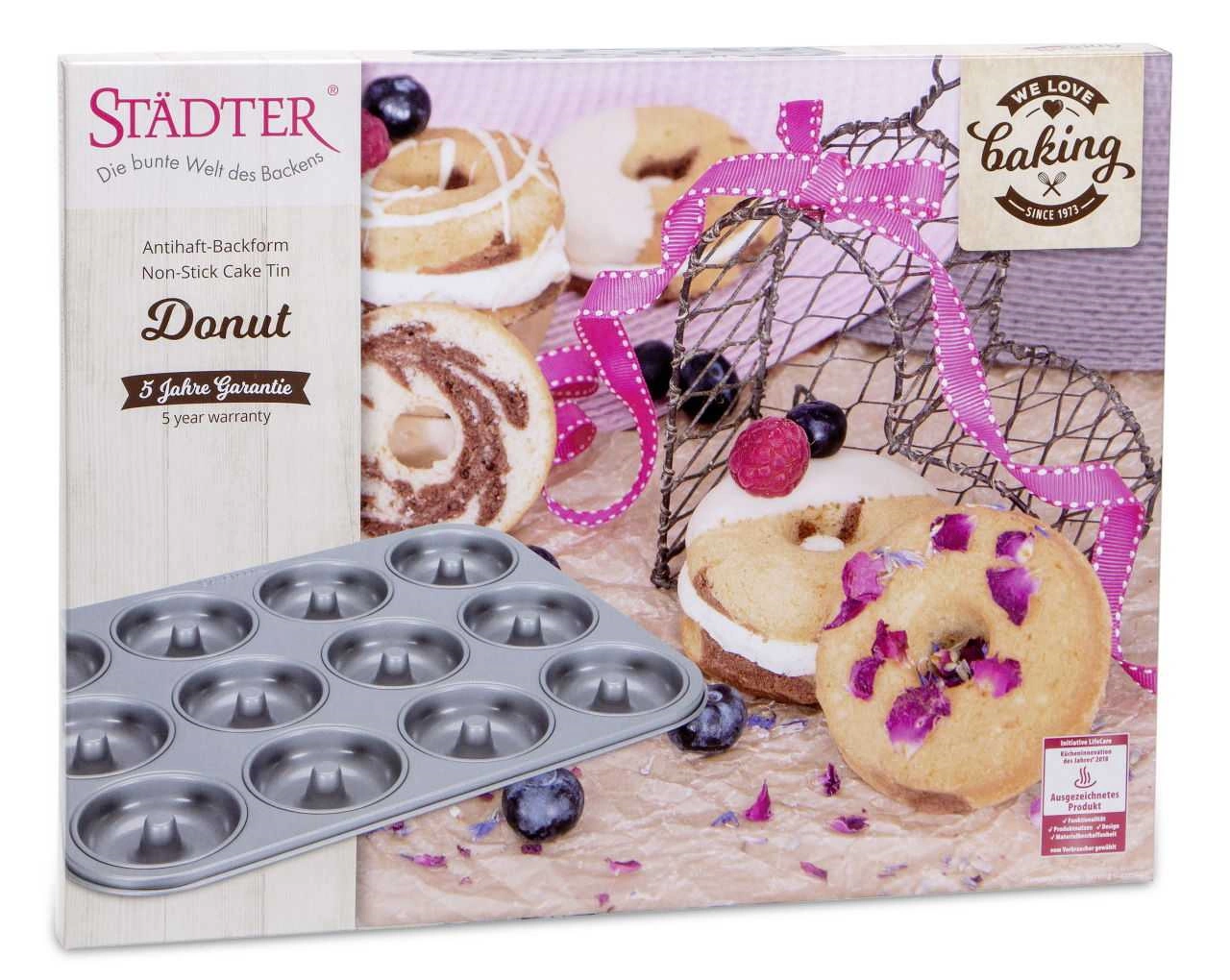 Antihaftbeschichtete Backform von Städter zum Backen von 12 köstlichen Donuts. Die Form eignet sich aber nicht nur für Donuts, sondern auch für kleine Bagels z.B. für den Fußballabend oder ein Buffet. Die hochwertige Beschichtung ermöglicht das leichte Lösen der Donuts aus der Backform und eine einfache Reinigung. So macht Backen Spaß!
