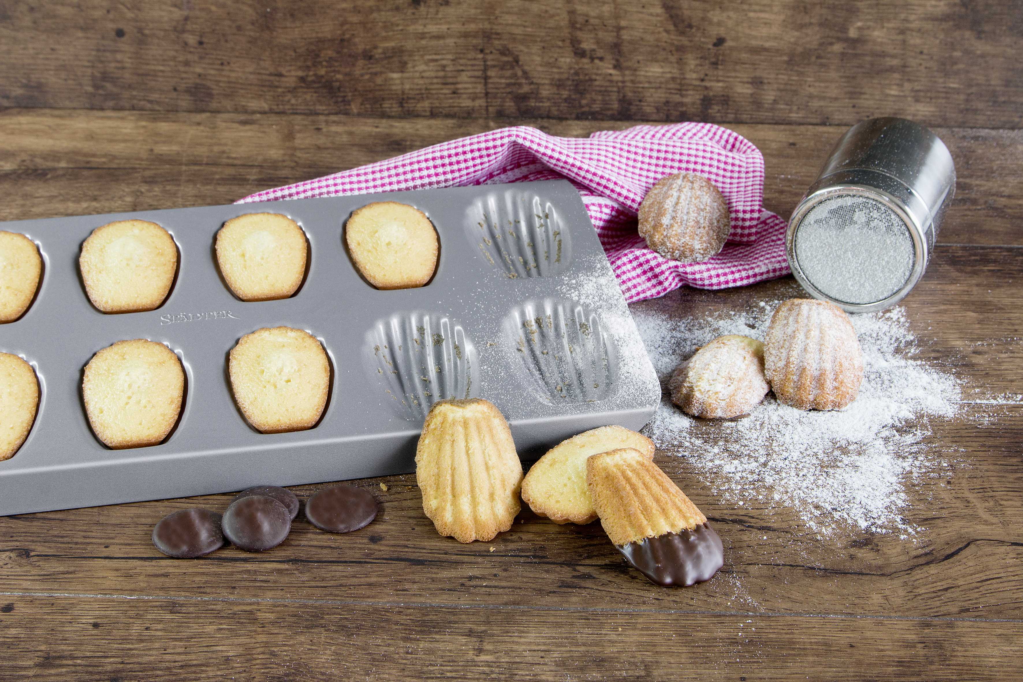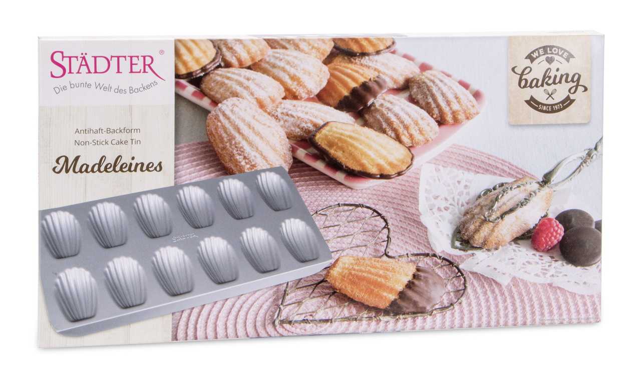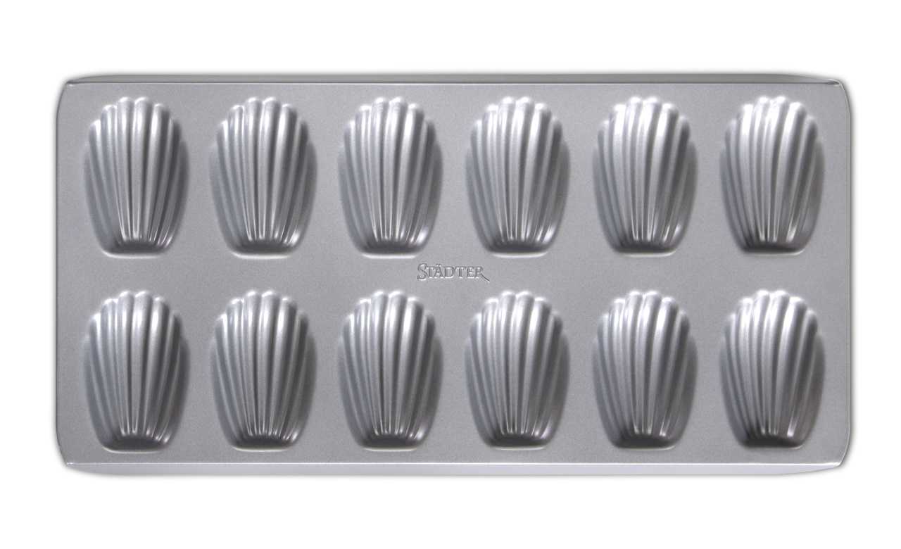 Die beliebten Madeleines werden auch Bärentatzen genannt. Aufgrund ihrer sandigen Konsistenz zergehen sie förmlich auf der Zunge, was das muschelförmige Gebäck besonders beliebt zu Kaffee und Tee macht. Mit dieser Städter Backform backen Sie 12 Madeleines gleichzeitig. Die hochwertige Antihaftbeschichtung ermöglicht das leichte Lösen des Gebäcks aus der Form und erleichtert die anschließende Reinigung. So macht Backen Spaß!