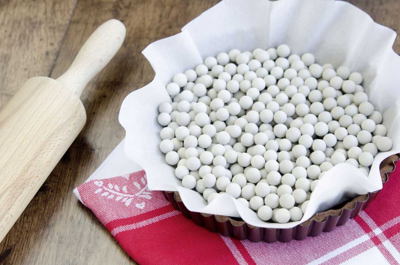Den Teig in die Backform geben und mehrmals mit einer Gabel einstechen. Eine Lage Backpapier auf den Teig legen und die Blindbackkugeln daraufgeben. Dann den Teig backen und anschließend gut auskühlen lassen. Die Blindbackkugeln einfach mit warmen Wasser und etwas Spülmittel waschen und auf einem Geschirrhandtuch trocknen lassen.