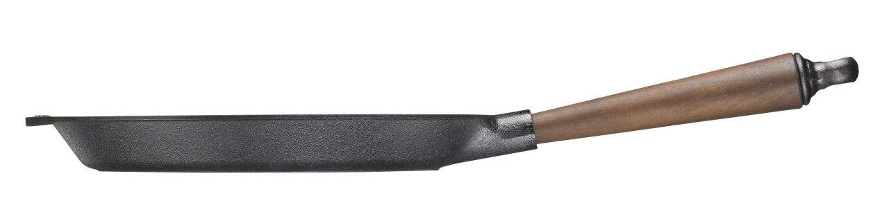 Die Skeppshult Bratpfanne mit dem edlen Walnussholz Griff hat beispielsweise für 2 bis 3 Scheiben Fleisch die richtige Größe. Der flache, schräge Rand erleichtert das Wenden von Lebensmitteln in der Pfanne. In Gusseisen gebratene Speisen schmecken intensiver und werden kross und saftig.