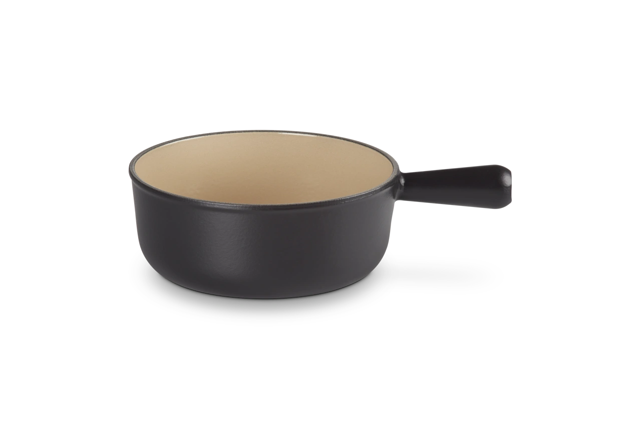 Das emaillierte Gusseisen, aus dem das Caquelon komplett gefertigt ist, leitet die Wärme direkt vom Boden bis hoch zu den Seitenwänden. Die hochwertige Emaillierung dieser Le Creuset Gusseisen Töpfe ist außen farbig oder schwarz. Innen ist sie cremefarben. Auch die Reinigung des Topfes ist aufgrund der Emaillierung ein Kinderspiel.