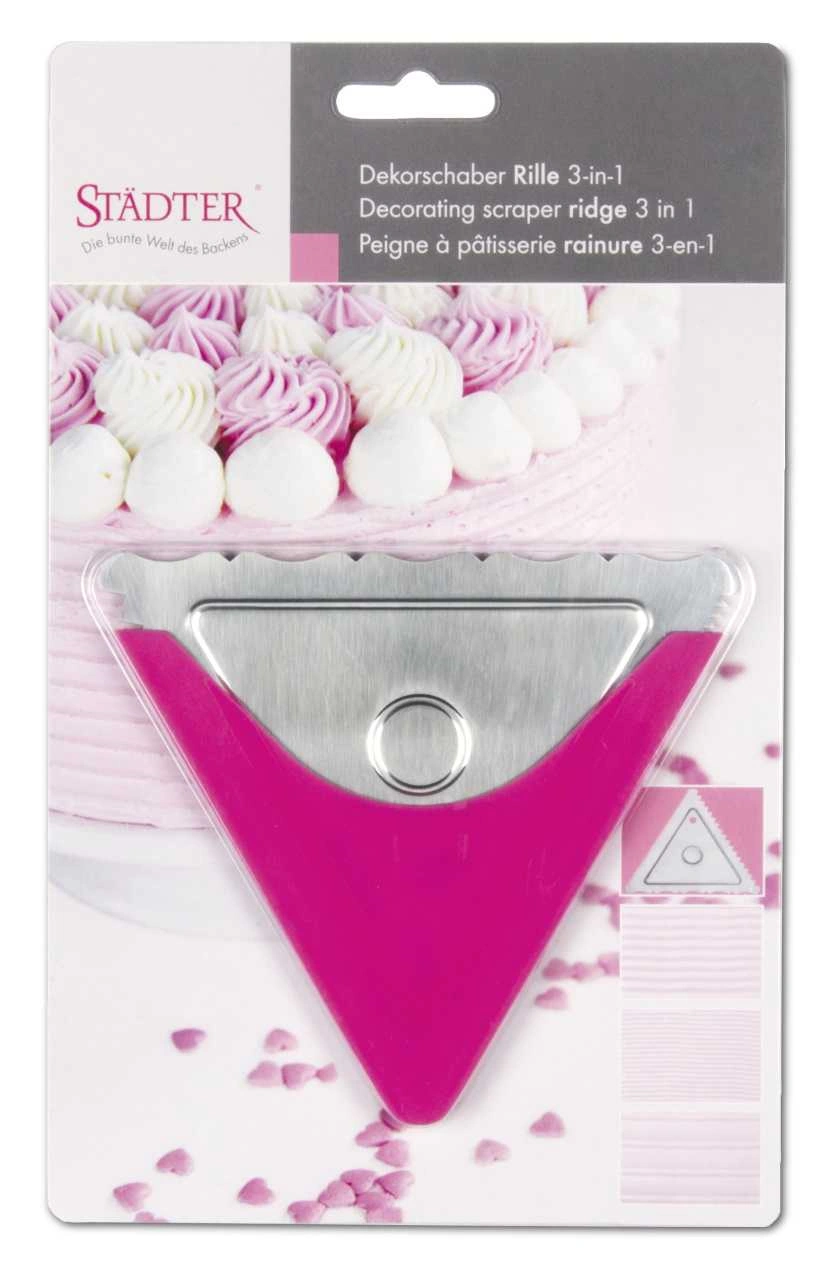 Mit dem Städter Dekorschaber 3-in1 können Sie Ihre Creme- oder Sahnetorten wunderschön verzieren. Der Dekorschaber ist für jeden Hobbybäcker das perfekte Backzubehör, um das Beste aus seinen Kreationen herauszuholen. Die 3 verschiedenen Muster des Dekorschabers eignen sich perfekt, um Tortenränder und Kuchenoberflächen zu garnieren. Das optimale Ergebnis wird erzielt, wenn Sie den Dekorschaber in einem 45°-Winkel ansetzen. Damit man sich während des Verzierens nicht an den anderen Seiten des Schabers verletzt, empfehlen wir den Silikonschutz über die nicht benötigten Seiten zu stecken.