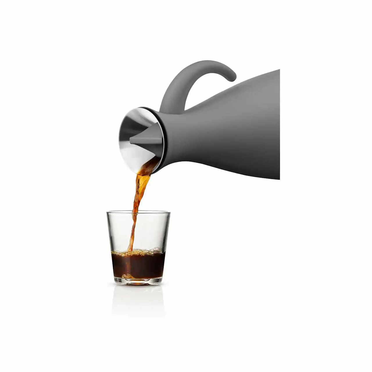 Die Eva Solo Isolierkanne aus hochwertigem Kunststoff verfügt über einen Glaseinsatz. Der patentierte, garantiert tropffreie Ausgießer ist aus Edelstahl. Das Befüllen der Isolierkanne ist dank der großen Öffnung besonders leicht. Außerdem steht die Kaffeekanne aufgrund ihrer Form sehr stabil. Die Höhe der Evs Solo Isolierkanne beträgt 29 cm, der maximale Durchmesser 15,5 cm. Sie fasst einen Inhalt von 1 Liter.