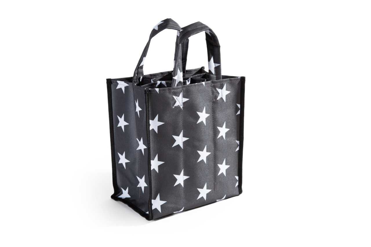 Die handliche Flaschentasche bringt Ihre Flaschen ohne Bruchgefahr und lästiges Klappern sicher nach Hause oder zum Picknick. Im Vergleich zu den sperrigen Getränkekisten bietet die Flaschentasche viele Vorteile. Das handliche Format und zwei reißfeste Trageriemen, sorgen für zusätzliche Stabilität.