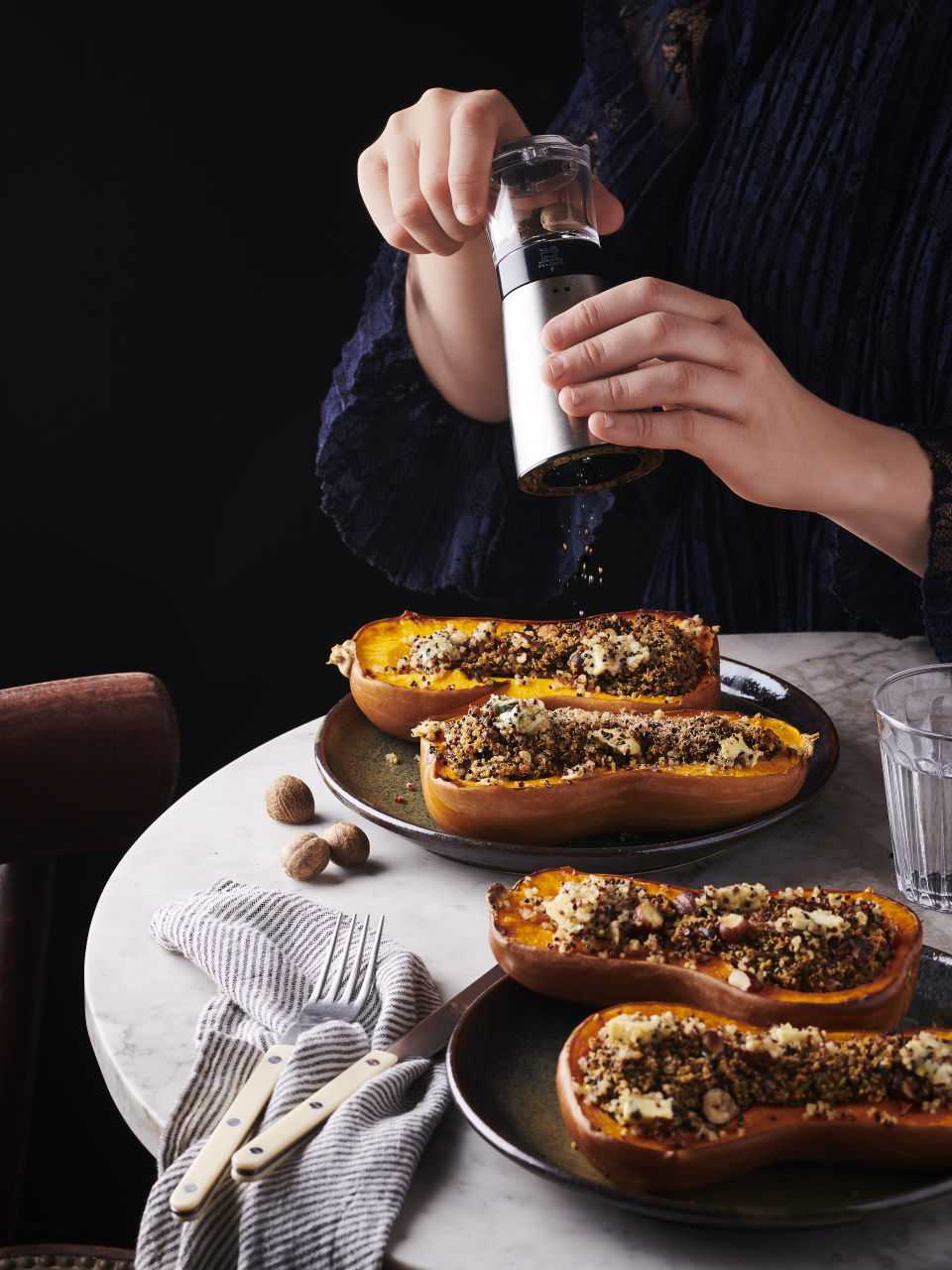 Elegante Edelstahl Muskatmühle Daman von Peugeot. Frische, fein gemahlene Muskatnuss verleiht Gerichten wie Grießklössen, flockigem Kartoffelpüree oder in Butter geschwenktem Rosenkohl die spezielle Note.