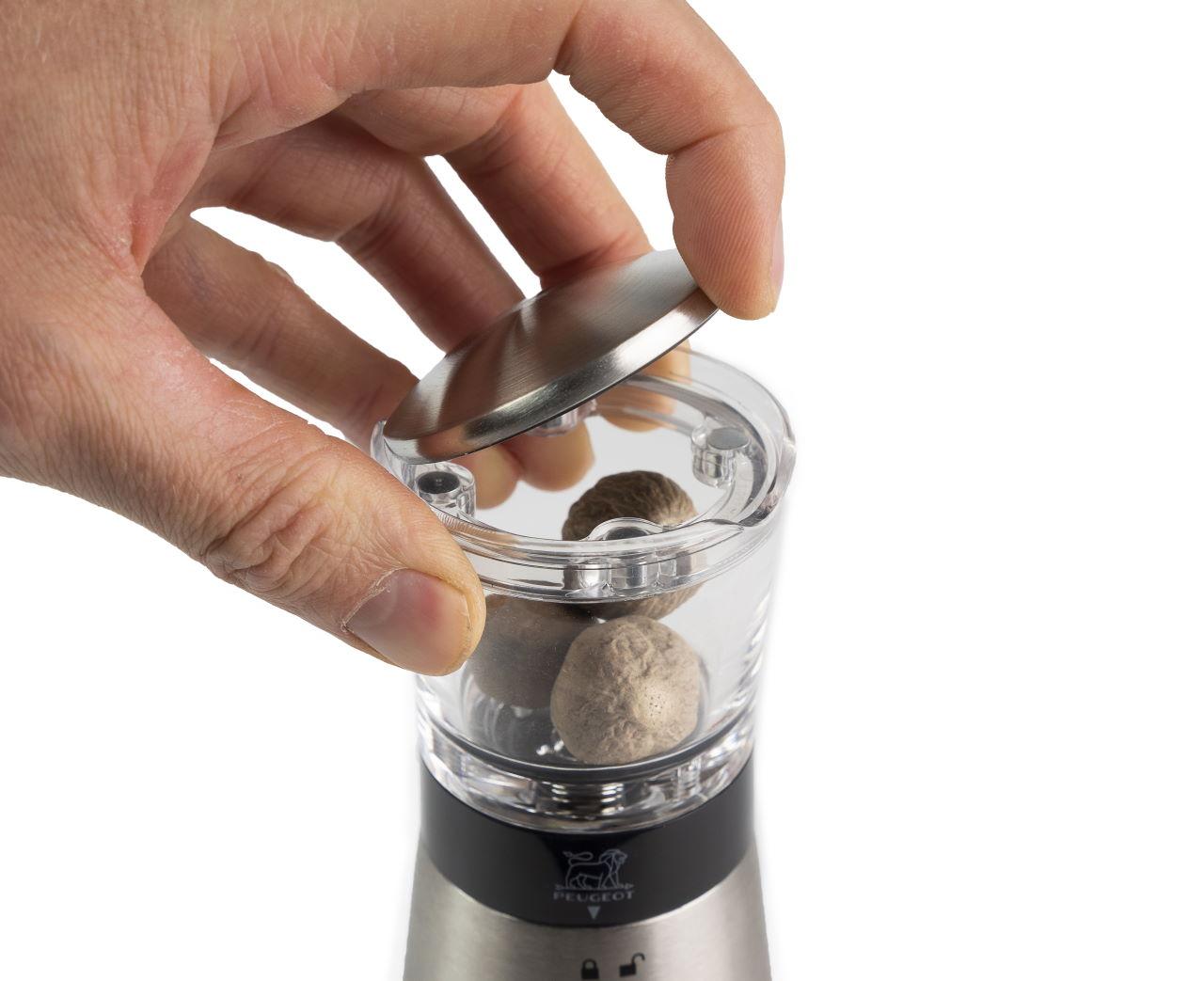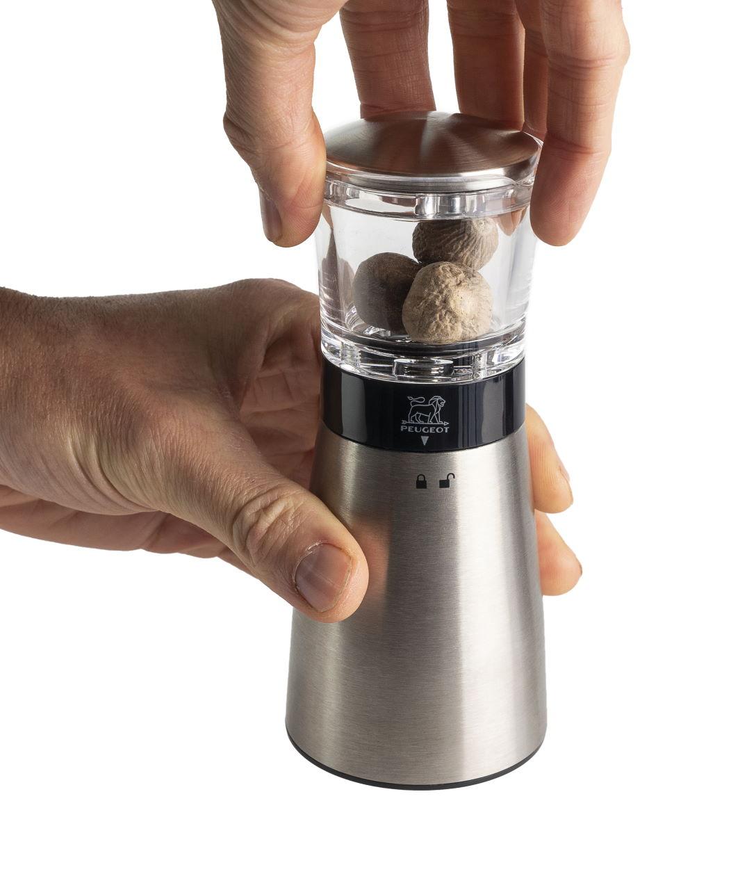 Moderne Muskatmühle Daman von Peugeot zum feinen Reiben und zur Aufbewahrung von ganzen Muskatnüssen.