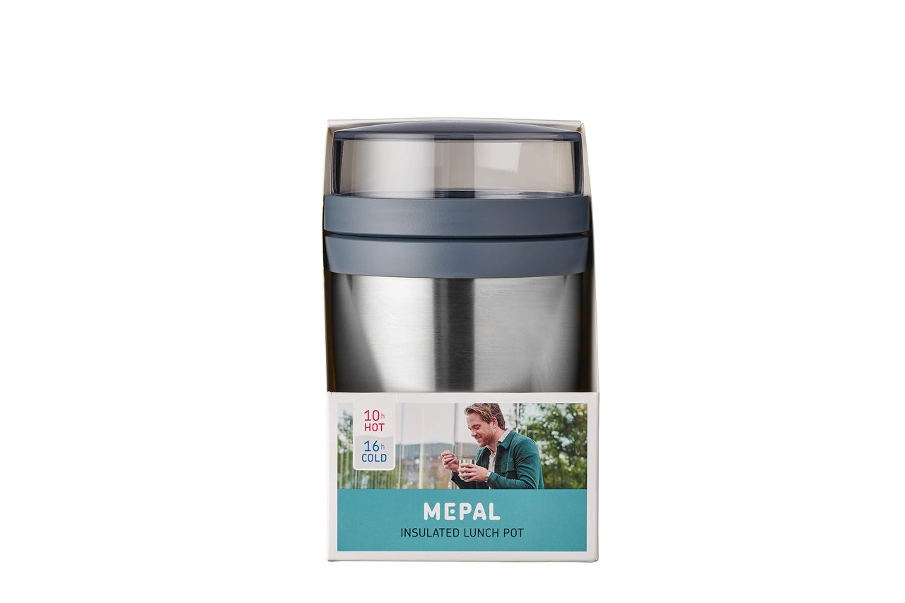 Der Thermo Lunchpot Ellipse von Mepal ist ein Speisegefäß to go, in dem Sie bequem warme und kalte Speisen für unterwegs mitnehmen. Bringen Sie Ihren Joghurt oder Quark mit Müsli, Früchten oder Cerealien, Salat samt Dressing sowie z.B. Nudeln mit Hacksauce oder Eintopf sicher zur Arbeit, Schule, in den Kindergarten usw. In zwei separaten Behältern werden die Zutaten getrennt voneinander aufbewahrt und erst kurz vor dem Verzehr zusammengegeben. So bleiben alle Zutaten knackig frisch. Der große, untere Behälter verfügt über eine doppelwandige Edelstahl Isolation und sorgt somit dafür, dass Speisen bis zu 6-8 Stunden warm oder bis zu 12 Stunden kalt bleiben.