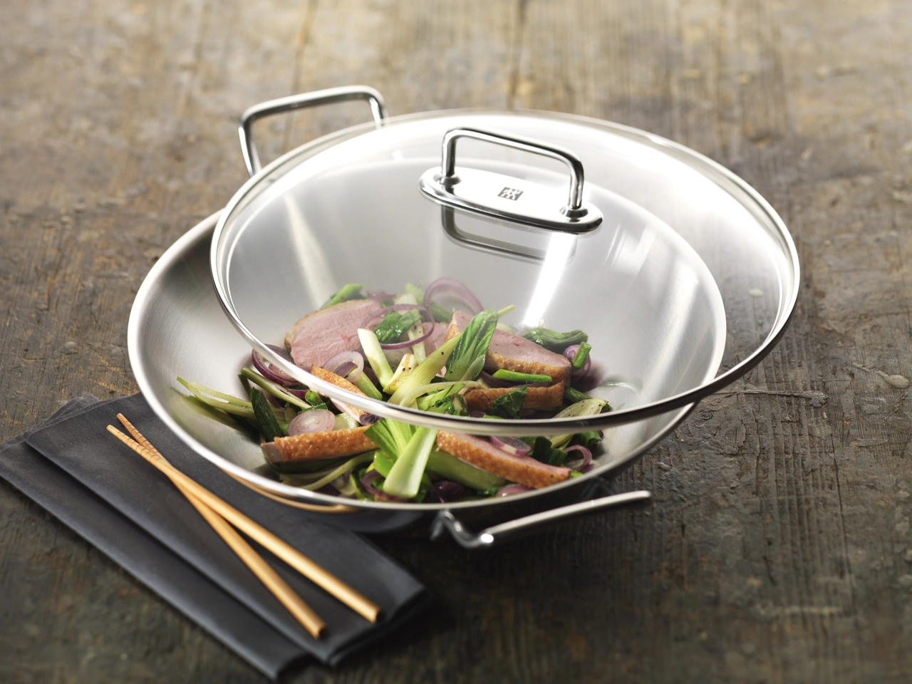 Zwilling Edelstahl Wok aus gleichmäßig wärmeleitendem 3 Schicht Material. Ideal für die frische Asia-Küche.
