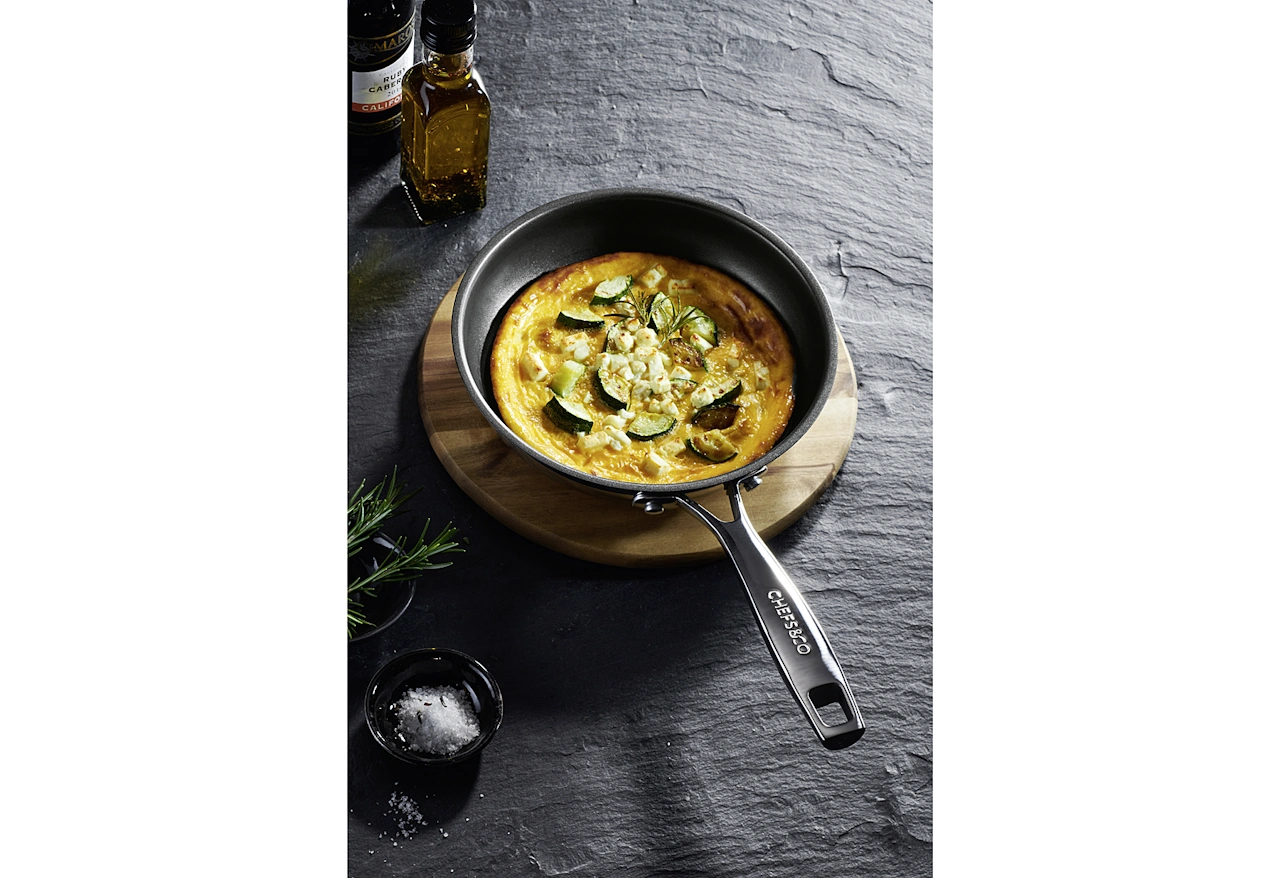 Die Pfanne besteht aus einem Pfannenkörper aus rostfreiem Edelstahl 18/10 mit einer hochwertigen Antihaft Beschichtung. Diese vermindert den Fettverbrauch und verhindert das Anhaften des Bratguts. Auch lässt sich die Pfanne leicht per Hand oder im Geschirrspüler reinigen. Edelstahl speichert die Wärme gut und hilft so beim Energiesparen. Die Pfanne von Chefs & Co. kann auf allen gängigen Herden inklusive Induktion verwendet werden. Weiterhin ist sie bis 230 °C backofengeeignet. Der ergonomische, angenietete Griff besteht aus Edelstahl und verfügt über eine Aufhängeöse.