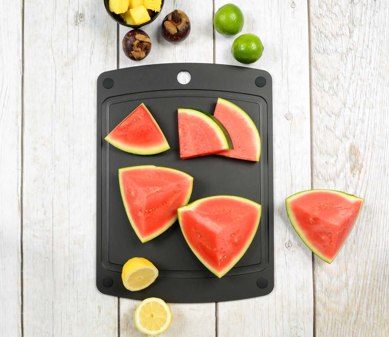 Das Jade Schneidebrett ist ein Schneidebrett aus umweltfreundlichem Zellulose-Laminat. Diese Ausführung des beliebten, schwarzen Schneidebrettes verfügt über 4 Antirutschfüße und eine Saftrille. Diese fängt den beim Schneiden von Fleisch und Gemüse austretenden Saft oder auch Brotkrümel sicher auf. Aber das Jade Schneidebrett eignet sich nicht nur zum Zubereiten, sondern auch zum Servieren von z. B. Käse- und Wurstplatten für ein Buffet sowie als Untersetzer für Bräter oder heiße Backbleche. Diese Ausführung des schwarzen Jade Schneidebrettes ist in 3 Größen erhältlich.