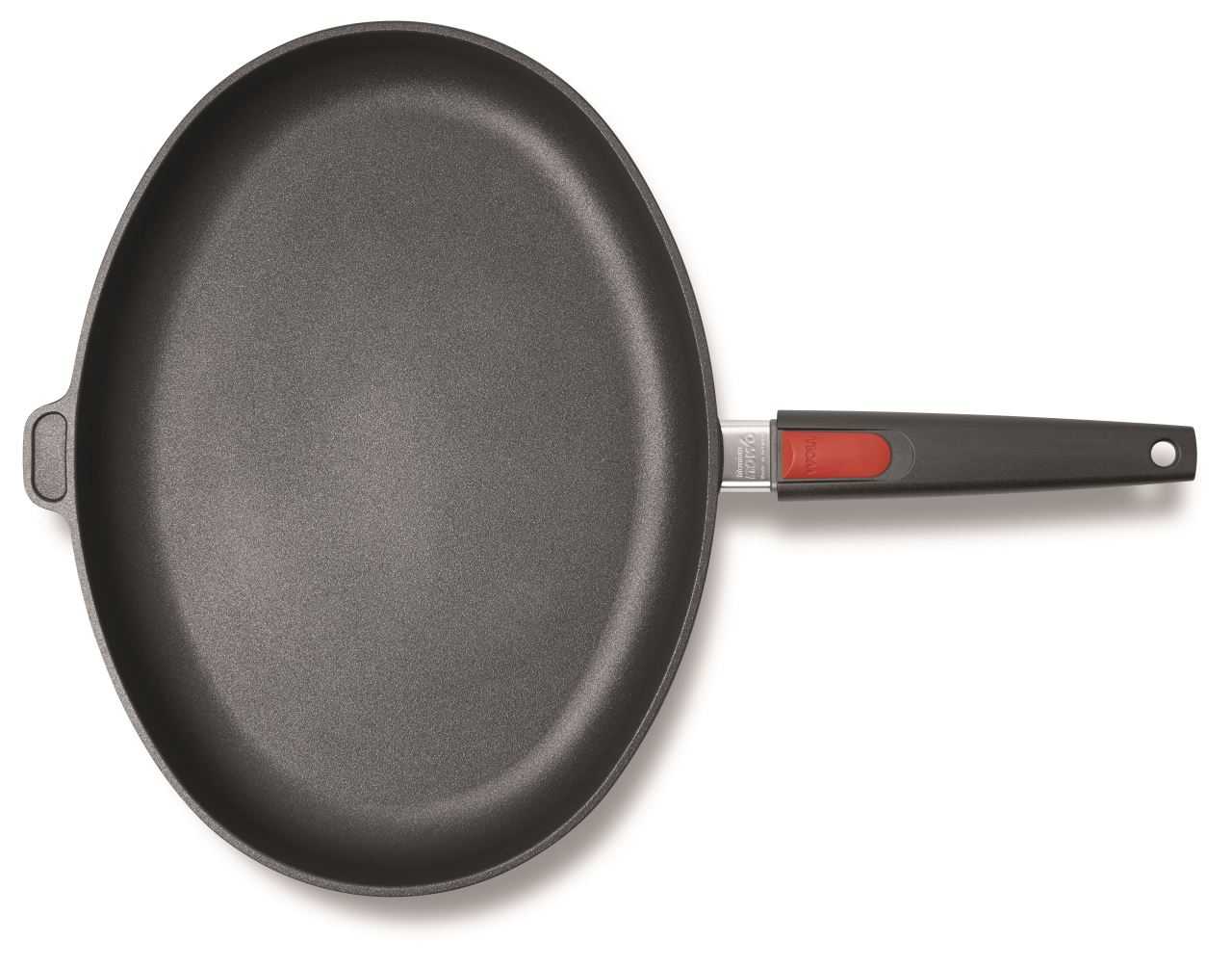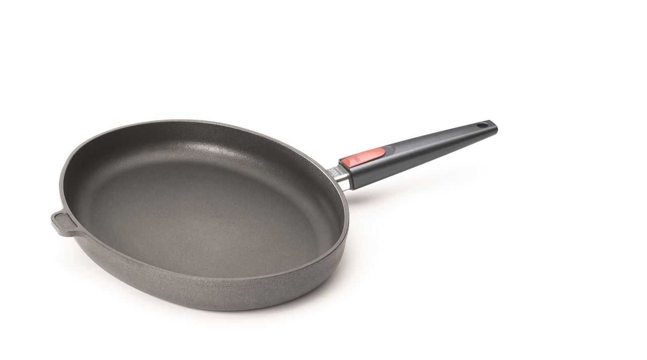 Fisch im Ganzen zu braten ist mit der ovalen Woll Antihaft Fischpfanne kein Problem mehr. Mit einer Größe von 38 x 28 cm ist die Pfanne groß genug für 2 bis 3 Forellen. Auch mehrere panierte Schnitzel können in dieser Pfanne gleichzeitig gebraten werden. Dank der robusten und langlebigen Antihaftbeschichtung der Woll Aluguss Pfanne backen Speisen beim Braten nicht an, auch wenn Sie nur wenig Bratfett verwenden. Woll Alu Pfannen sind daher ausgezeichnet für empfindliches Bratgut geeignet. Auch dem scharfen Anbraten von z.B. Rouladen oder Kurzgebratenem hält die Beschichtung mühelos stand.