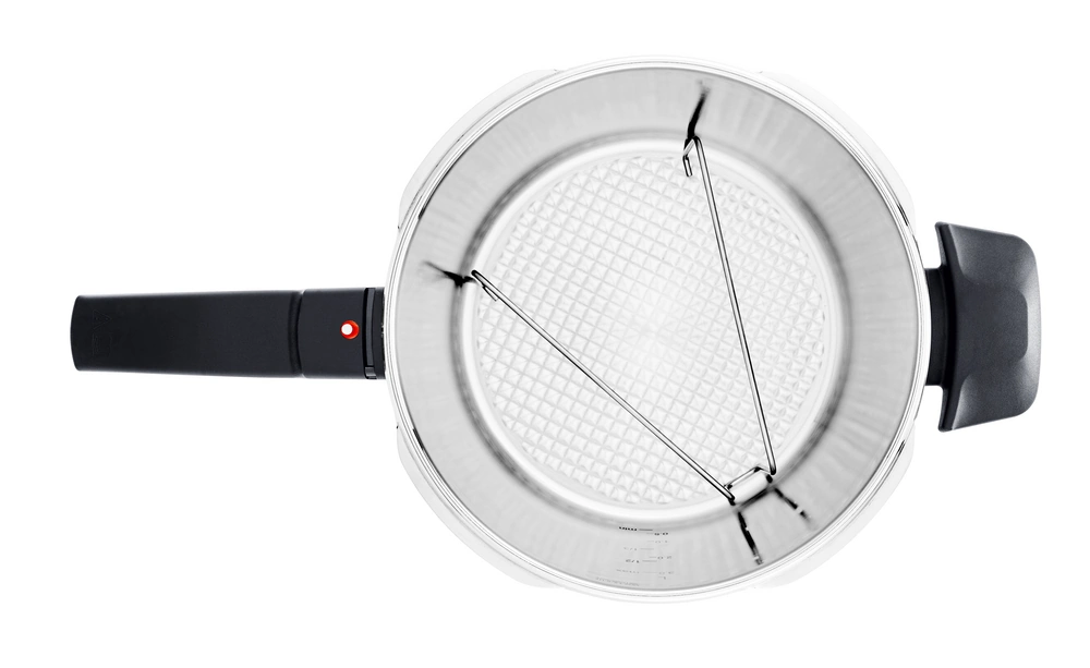 Der Deckel ist mit einer praktischen Aufsetzhilfe versehen, die in Kombination mit dem verbesserten Topfrand für ein leichtes Verschließen des Topfes sorgt. Ist der Schnellkochtopf richtig verriegelt, wird dies durch ein Klickgeräusch bestätigt. Die im Sicherheitsschlaufen-Griff integrierte Ampelfunktion schaltet gleichzeitig von "rot" auf "grün". Das Druckgaren kann beginnen.