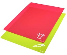 Im Set sind 4 flexible Schneidbretter enthalten. Auf der roten Schneidmatte ist ein Kuhkopf abgebildet, auf der grünen eine Tomate, auf der gelben ein Huhn und auf dem blauen ein Fisch. Die Farben und Symbole dienen zur leichten Orientierung. Lebensmittelexperten empfehlen, für das Schneiden von unterschiedlichem Schneidgut verschiedene Schneidbretter zu verwenden, um die Übertragung von Bakterien zu verhindern.