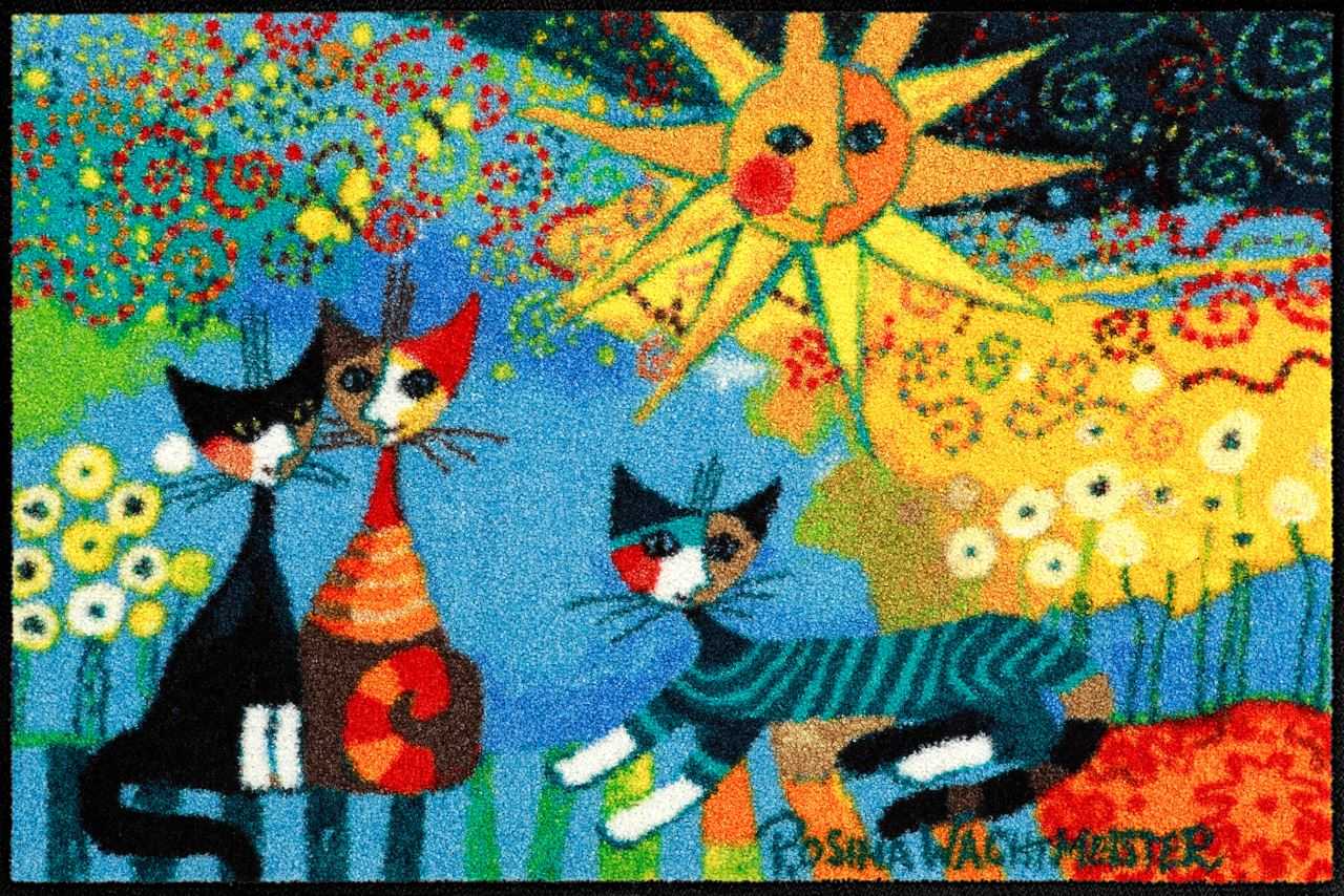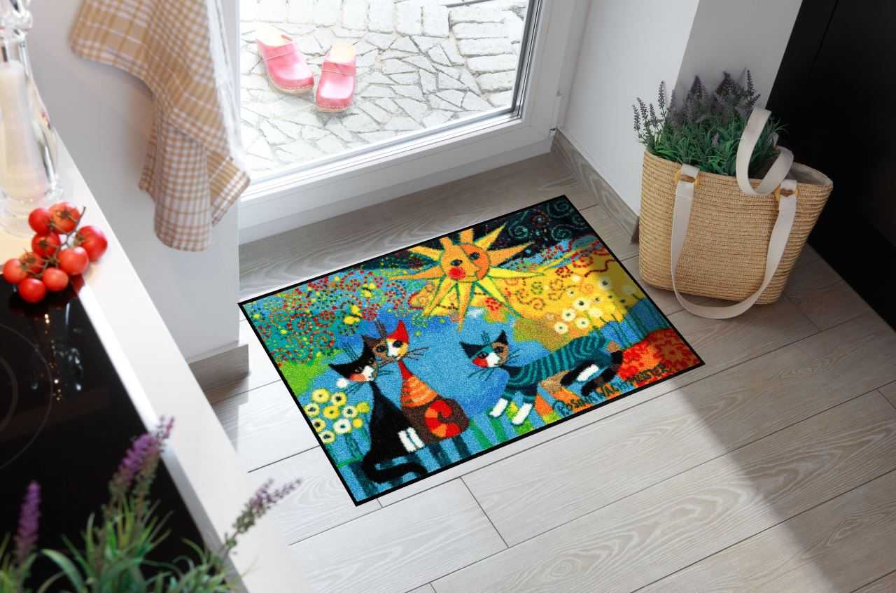 Bunte Salonlöwe Fußmatte aus der Kollektion "Rosina Wachtmeister" mit den beliebten Motiven der Künstlerin im charakteristischen, romantischen Stil. Die Wohnmatte "La dolce vita" verbreitet stets Fröhlichkeit und gute Laune.
