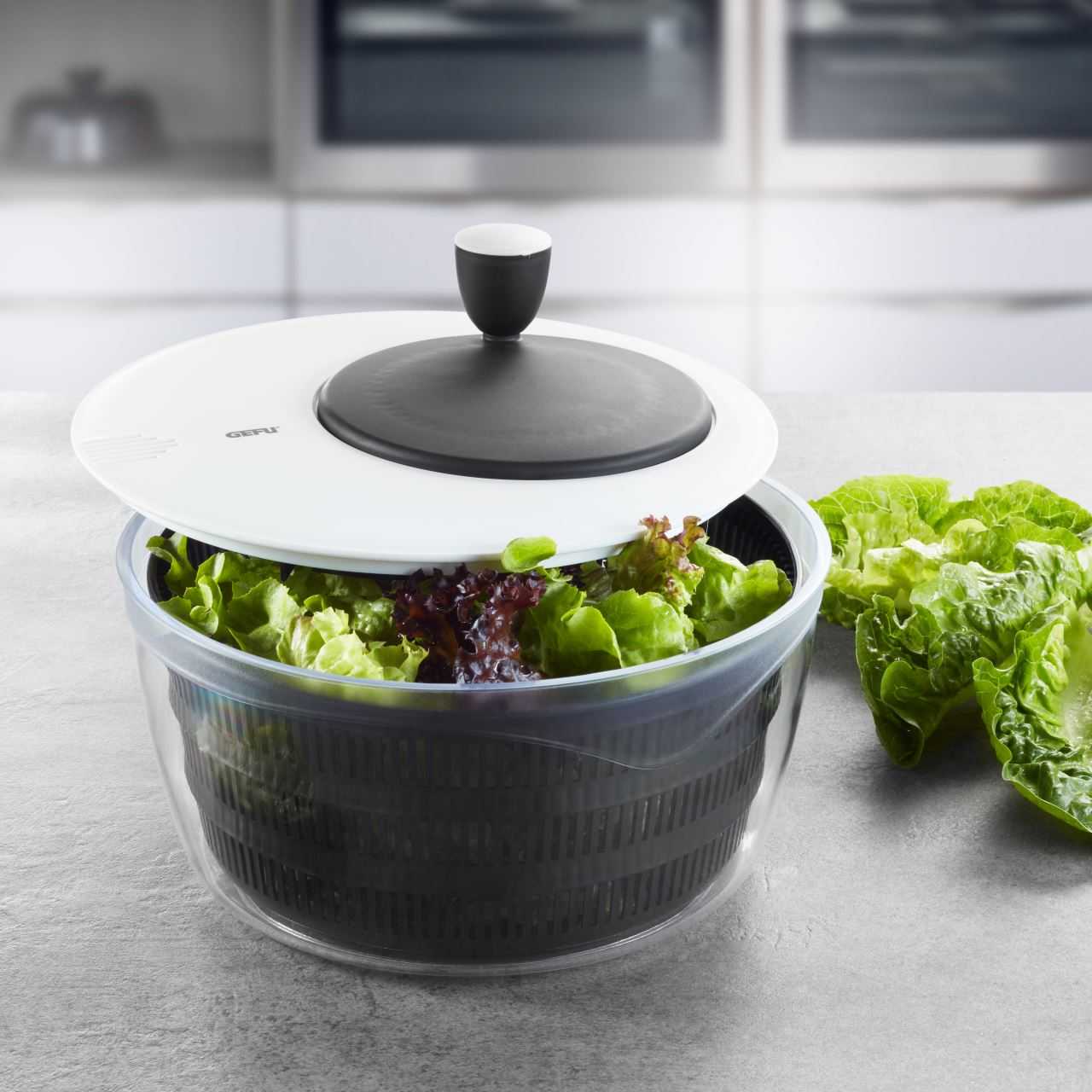 Die schwarze Gefu Kunststoff Salatschleuder besteht aus einer Schüssel, dem Siebeinsatz und dem passenden Deckel. Im Deckel befindet sich eine Öffnung zum Abgießen von Flüssigkeiten. Der Siebeinsatz ist zusätzlich als Seiher einsetzbar, die durchsichtige Schüssel ist hübsch zum Servieren.