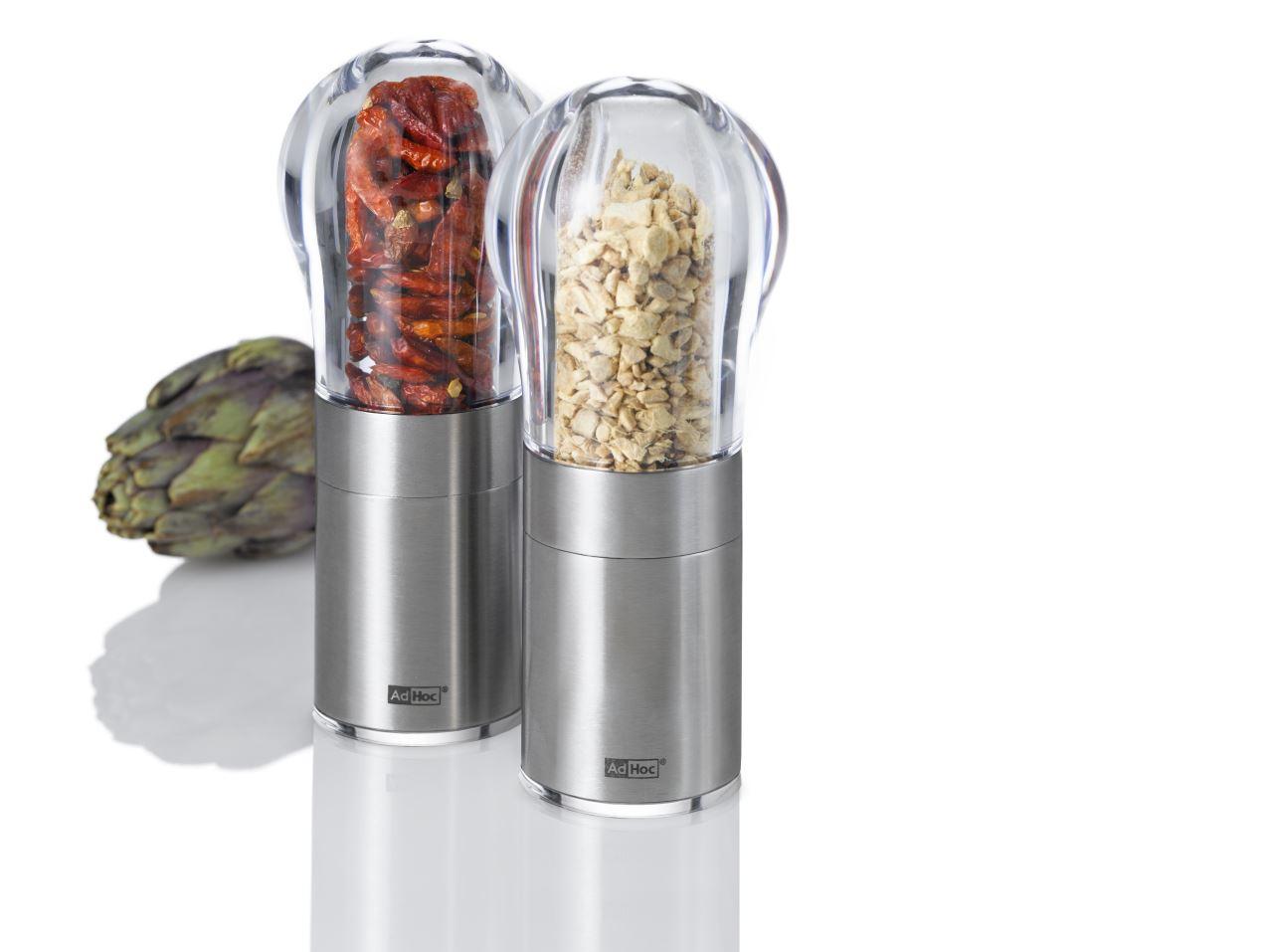 Mit dem Chili- und Gewürzschneider von AdHoc schneiden Sie getrockneten Chili und Gewürze wie Anis, Koriander, Ingwer, Kümmel, Fenchel oder Sesam zum feinen Würzen. Da die Gewürze geschnitten und nicht gerieben werden, können sich die ätherischen Öle und damit alle Aromen voll entfalten. Sie benötigen weniger Gewürze für mehr Geschmack. Gleichzeitig ist die Gewürzmühle ein toller Blickfang in Ihrer Küche.