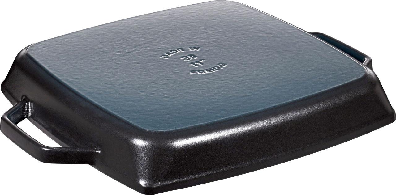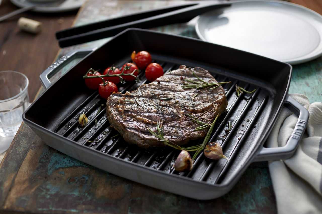 Grillpfanne von Staub aus emailliertem Gusseisen ideal zum fettreduzierten, aromatischen Braten von Fleisch, Fisch und Gemüse.