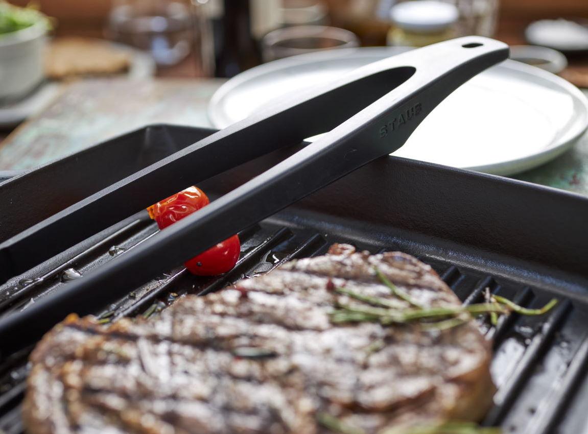 Emaillierte Gusseisen Grillpfanne von Staub zum fettreduzierten, geschmackvollen Braten von Fleisch, Fisch und Gemüse.