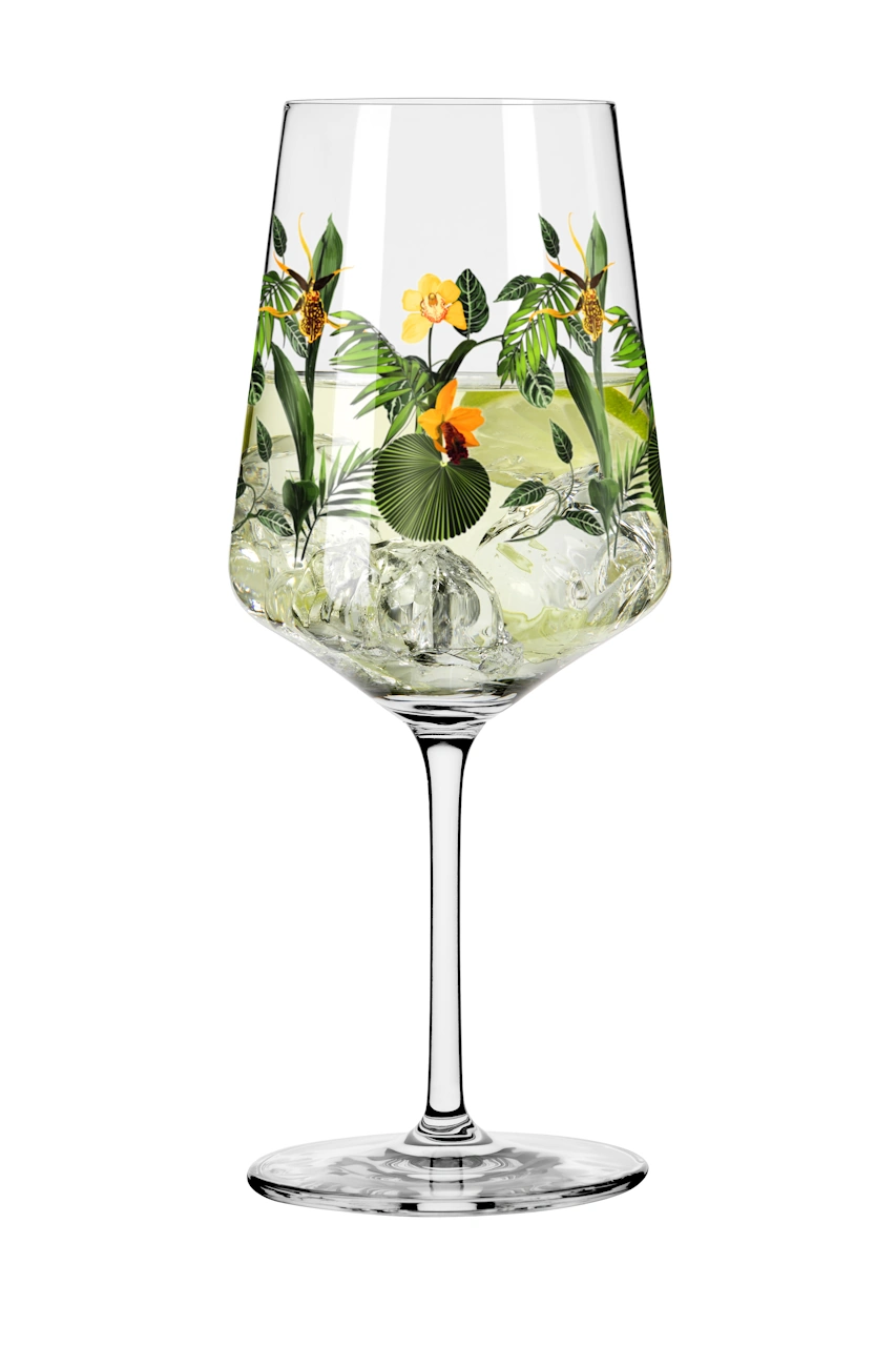 In dem hübschen, sommerlichen Aperitifglas von Ritzenhoff aus der Serie Sommertau sehen Ihre Spritz-Cocktails besonders schön aus. Durch sein sommerliches-Motiv wirken Aperol Spritz, Weinschorlen, Weißwein und Hugo besonders appetitlich. Das Glas wird von einem grünen Orchideen-Motiv verziert.