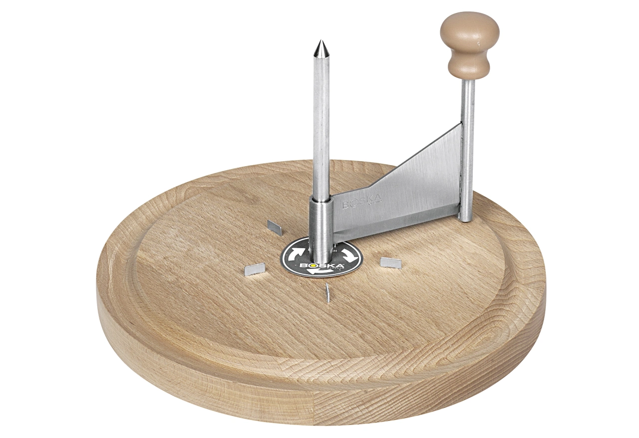 Der Teller aus hellem Buchenholz hat einen Durchmesser von 22 cm. Für einen rutschfesten Stand beim Kurbeln sorgen 5 kleine Füße auf der Unterseite. Auf der Oberseite halten 5 kleine Widerhaken den Käse an Ort und Stelle. Das Hobelmesser des Käseschneiders ist aus rostfreiem Edelstahl gefertigt. Die Kunststoff Glocke sorgt dafür, dass der Käse frisch bleibt und sein Aroma erhält.