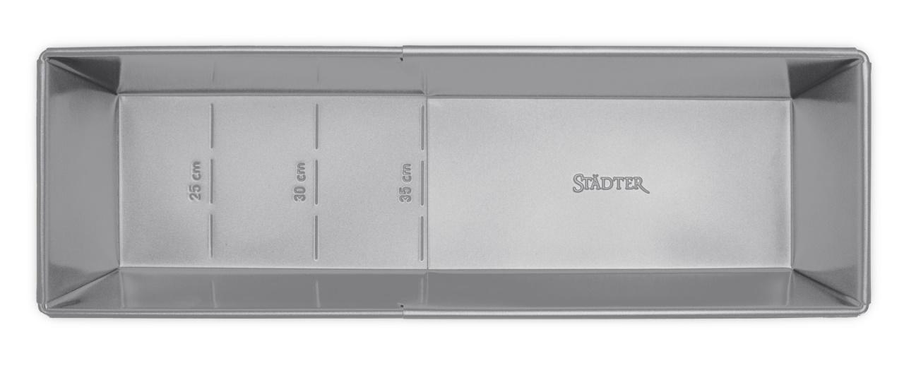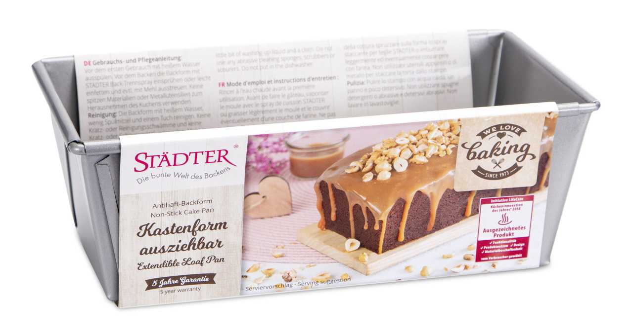 Mit dieser ausziehbaren Kastenform können Sie einen großen, leckeren Kastenkuchen für Geburtstage, Hochzeitstage oder einfach ohne Anlass backen. Wenn Sie nicht so viele Mitesser haben, backen Sie Ihren Lieblingskastenkuchen auch ganz einfach in einer kleineren Version. Mit den Städter Backformen der "we love baking"-Serie wie dieser ausziehbaren Kastenform, auch Königskuchenform genannt, ist das Backen ein wahres Vergnügen!