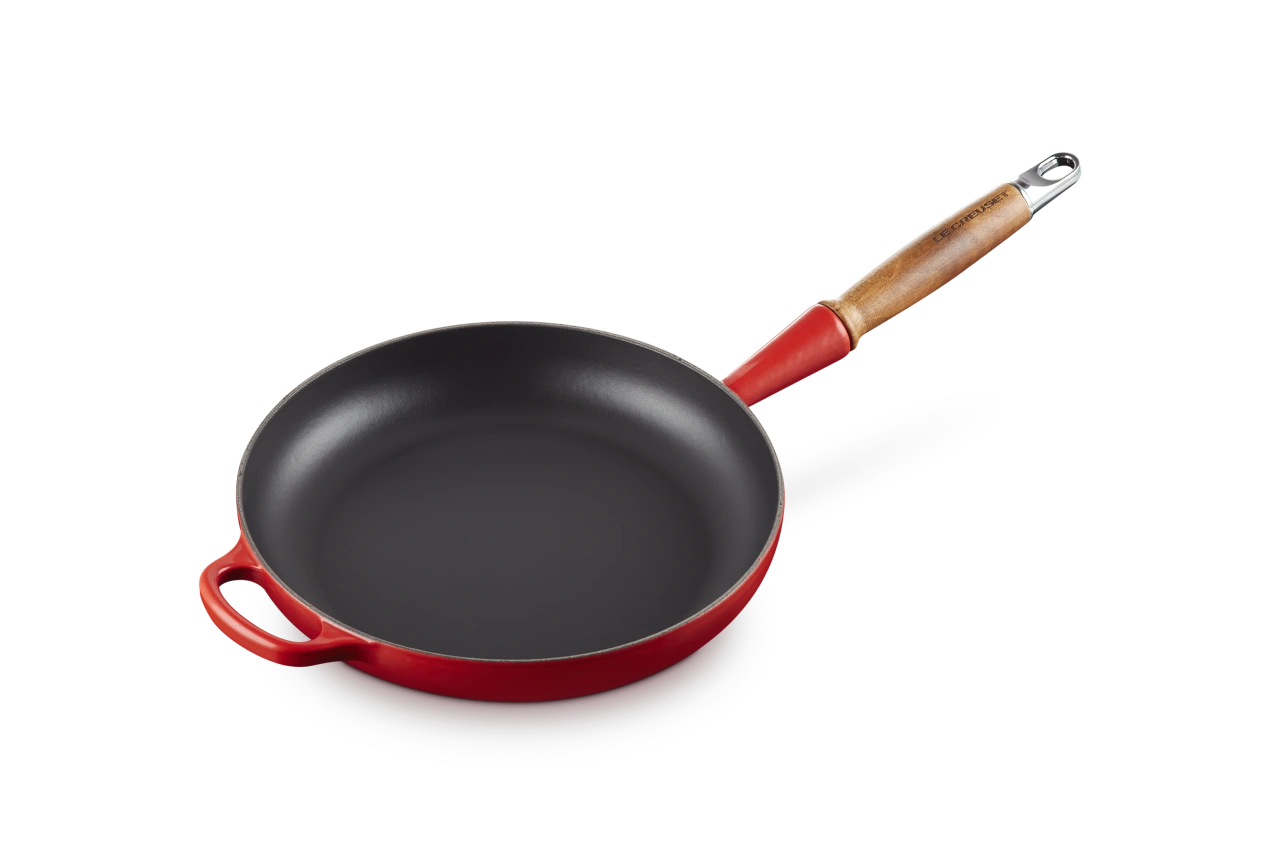 Die französischen Gusseisen Pfannen von Le Creuset eignen sich hervorragend für das scharfe Anbraten von Fleisch und zum gesunden, aromatischen und energiesparenden Braten und Schmoren auf mittleren Temperaturen. Durch den Holzgriff und den Gegengriff aus Gusseisen ist das Handling der Pfanne auch mit Inhalt einfach.