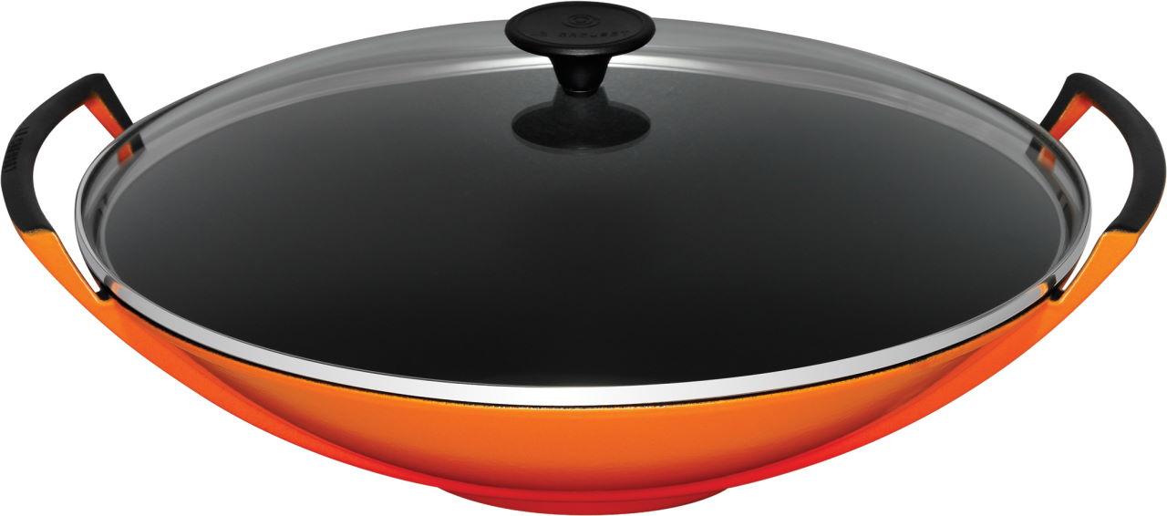 Großer, ofenroter Le Creuset Gusseisen Wok mit Deckel ideal für knackige Gemüse-, Nudel- und Asiagerichte.