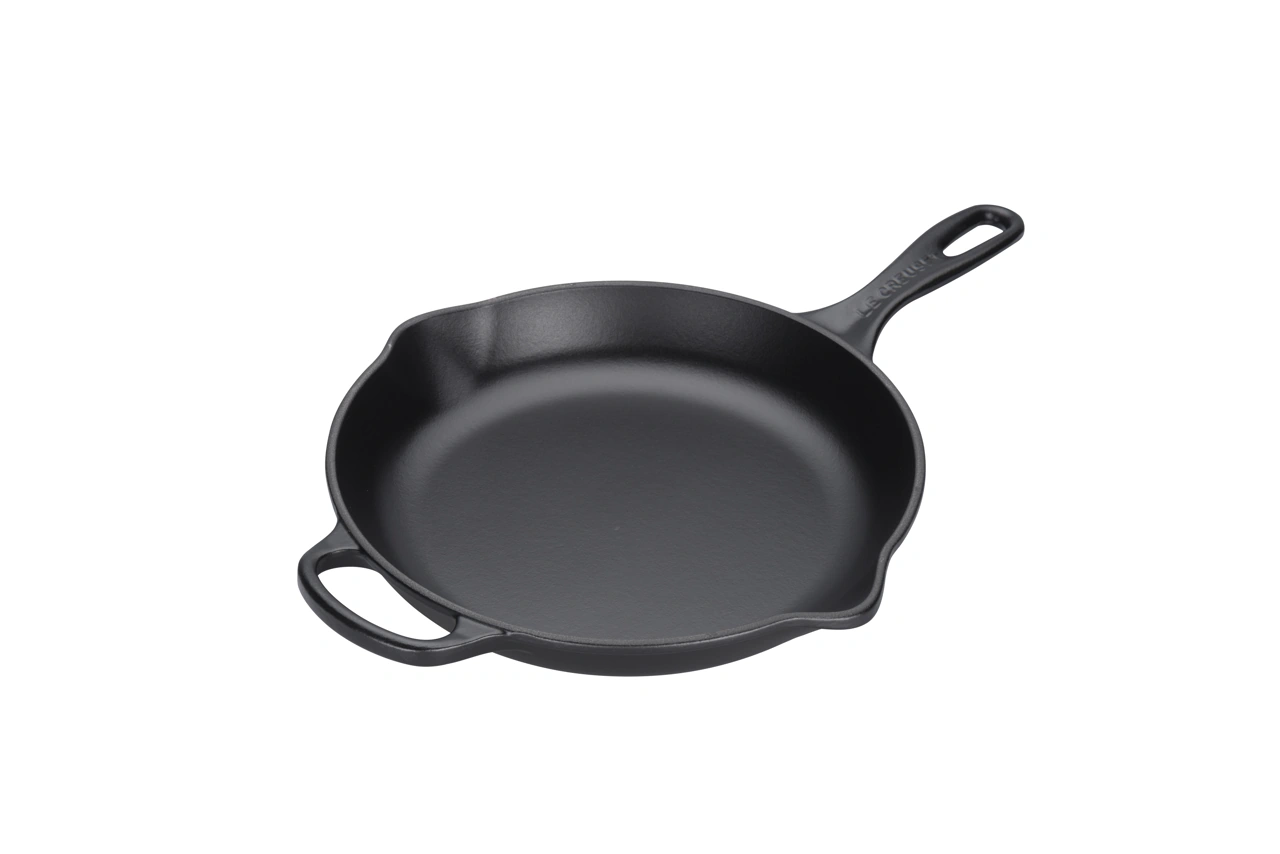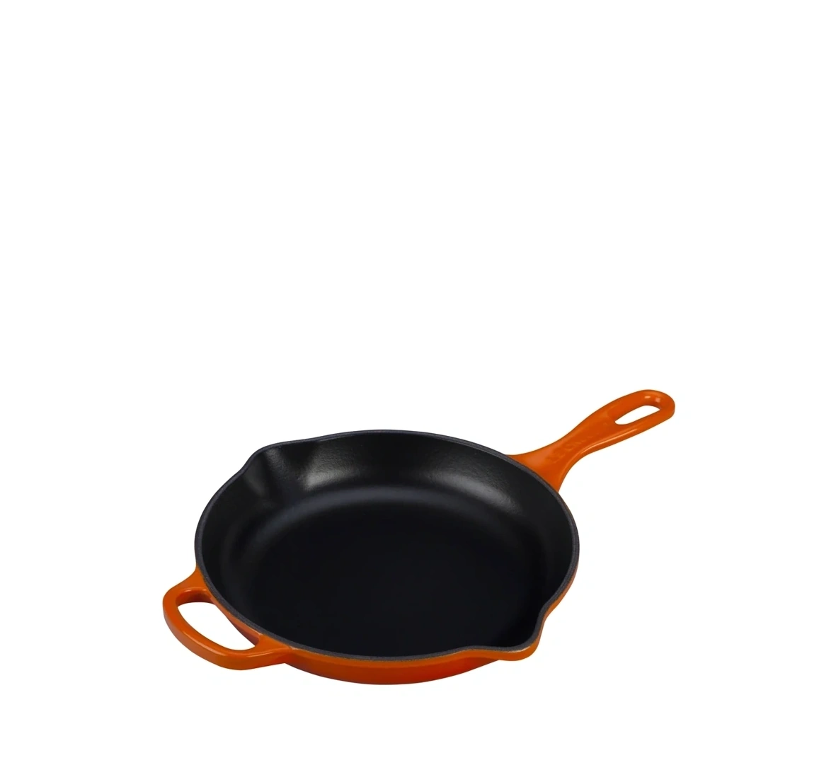 Hohe Le Creuset Brat- und Servierpfanne mit extra großem Gegengriff und 2 Ausgüssen - komplett aus Gusseisen.