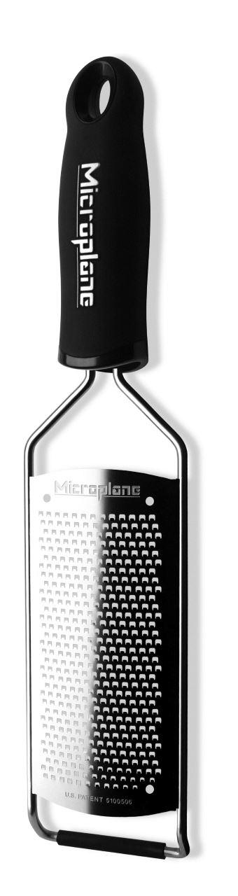 Diese Reibe ist die breite Ausführung der beliebtesten Microplane Reibe "Zesterreibe Premium Serie". Sie eignet sich besonders gut zum Reiben und Streifen schneiden von Zitrusschalen. Die Zesterreibe zieht mit ihren scharfen Schneidzähnen dabei nur die äußere Schale der Zitrusfrucht ab. Die Edelstahl Klingen der Microplane Reiben sind so rasiermesserscharf, dass Lebensmittel ohne Mühe gerieben werden können. Dabei wird das Reibgut fein geschnitten und nicht zerdrückt.