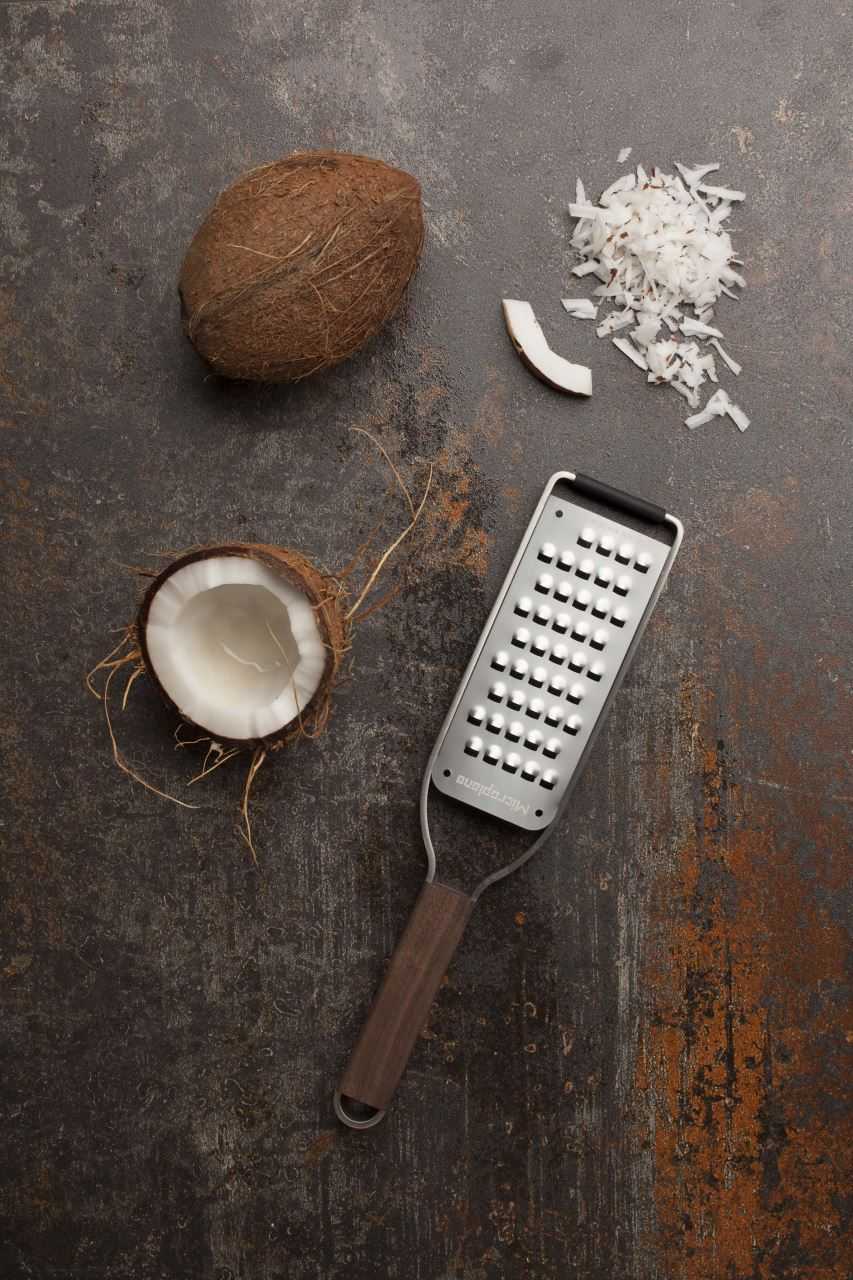Breite, extragrobe Reibe von Microplane zum leichten Reiben von Käse, Schokolade oder Gemüse.