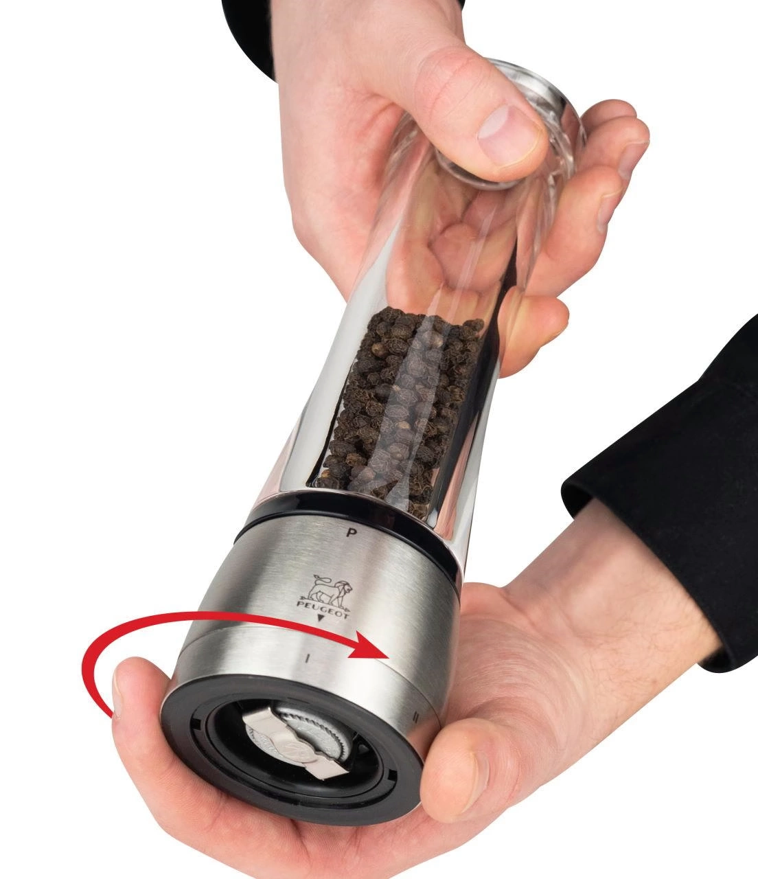 Salz- und Pfeffermühle sind mit der U-Select Mahlgradeinstellung ausgestattet. Dadurch kann der Mahlgrad genau eingestellt werden. Dies geschieht durch das Drehen des Stellringes am unteren Ende der Peugeot Mühle. Informationen zum Umgang mit Peuget Gewürzmühlen.