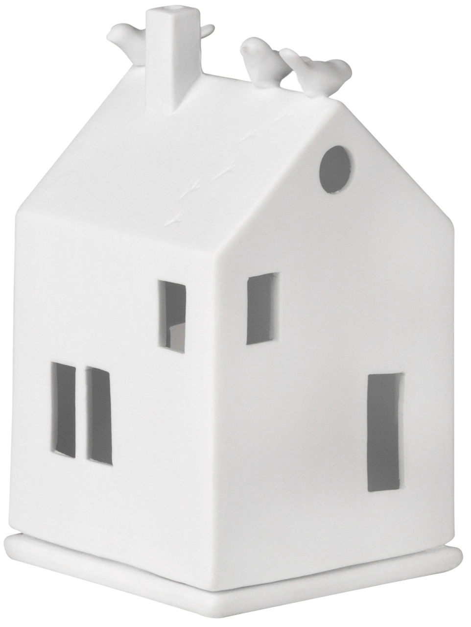Das kleine Lichthaus "Vogelhaus" von Räder sorgt für ein tolles Lichterspiel. Stellt man eine Kerze oder ein beliebig anderes Licht in das Haus, so scheint das Licht durch die kleinen Fenster und den Schornstein und sorgt somit für ein gemütliches Licht. Das Häuschen ist aus unglasiertem Porzellan hergestellt und wird von kleinen Vögelchen auf dem Dach verziert. Es hat eine Länge und Breite von 7 cm und eine Höhe von 13 cm.