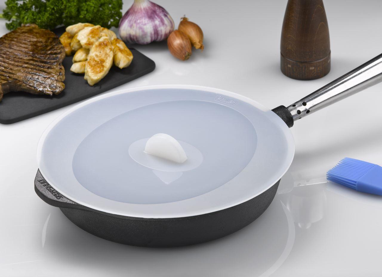 Beim Kochen und Braten läßt der Multifunktionsdeckel Luft ab. Er dient so als Spritzschutz. Beim Abkühlen saugt sich der Deckel an und hält die Wärme länger. Zum Lösen des Deckels diesen an einem Punkt seitlich leicht anheben. Der Silikon Deckel ist Temperaturbeständig bis 260 Grad. Er darf jedoch nicht in Kontakt mit offenen Flammen kommen oder direkt auf die Hitzequelle gelegt werden!