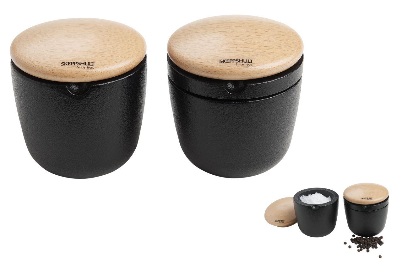 Das Skeppshult Gusseisen Pfeffer und Salz Set Swing wurde von dem Design Team Carl & Carl entworfen. Die beiden Behälter sind unten rund und besonders handlich. Das Set besteht aus einer Pfeffer- und Kräutermühle sowie aus einer Salzschale, bzw. einem Gewürzbehälter mit Deckeln aus hellem Buchen oder dunklem Walnussholz.