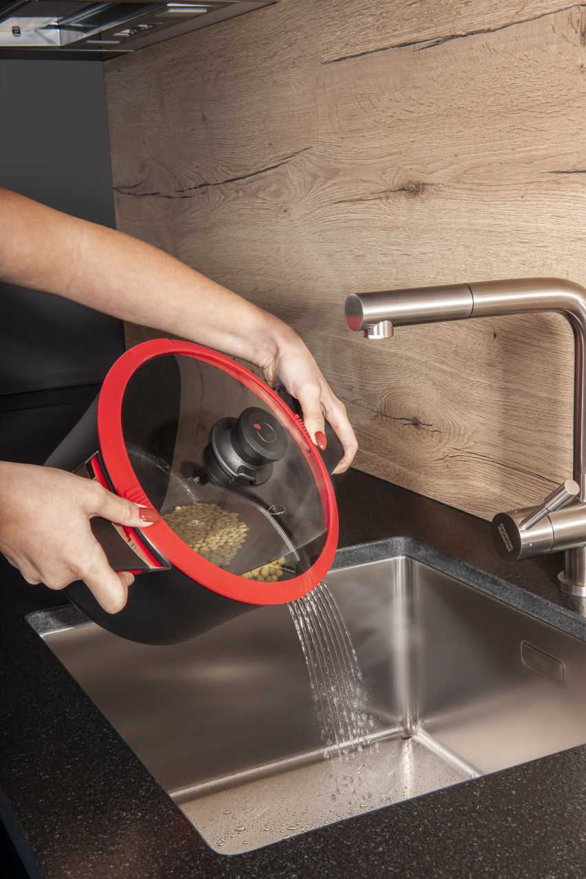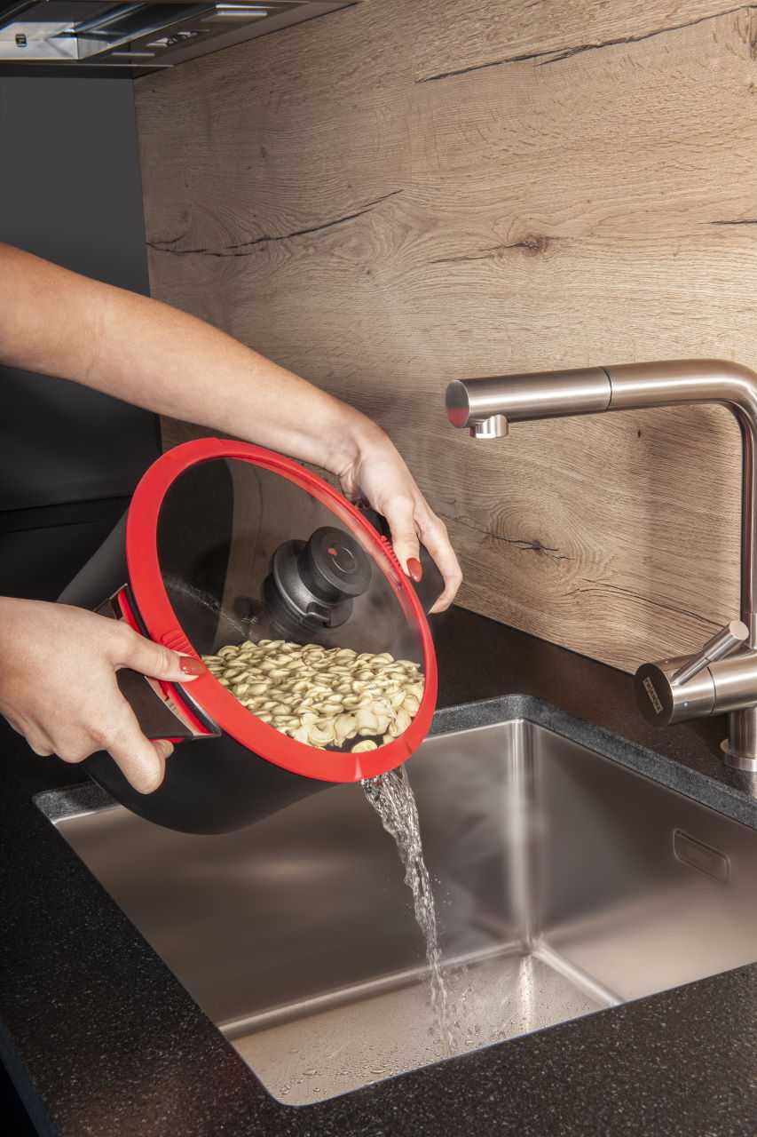 Dieser Glasdeckel von Squality ist ein wahrlich durchdachter Universaldeckel. Neben einem Dauerentlüftungsventil verfügt der Deckel über zwei Aussparungen in seinem roten Silikonrand. Diese ermöglichen das einfache Abgießen von Flüssigkeiten entweder im stärkeren oder sanften Strahl. Besonders eignet sich der Deckel für Aluguss Töpfe und Aluguss Pfannen, denn der Silikonrand verhindert ein Verkratzen des Topfrandes.