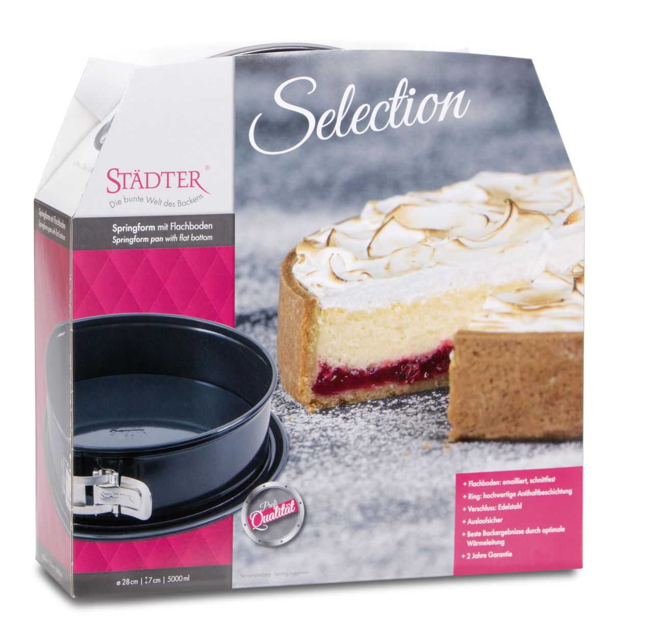 Mit den Städter Backformen aus der Premium Serie Selection ist das Backen ein Leichtes. In dieser Springform mit flachem Boden gelingen Ihnen saftige Obst- und Rührkuchenrezepte genauso wie Biskuitböden für erfrischende Torten. Backformen mit einem Durchmesser von 28 cm sind die gängigste Größe und passend für viele Rezepte.