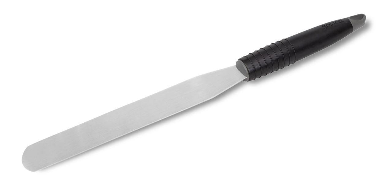 Die Streichpalette besteht aus hochwertigem, rostfreiem Edelstahl. Sie hat eine Länge von 34 cm und ist 3,3 cm breit. Ihr Soft-Griff besteht aus schwarzem Kunststoff und liegt angenehm in der Hand. Sie ist fruchtsäurebeständig und eignet sich für die Reinigung im Geschirrspüler.
