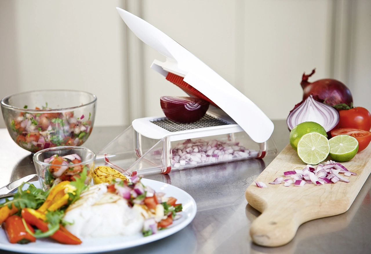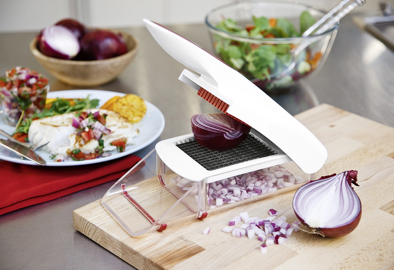 Zwiebel- und Gemüseschneider mit 2 Schneidgittern, Auffangbehälter und Reinigungshilfe zum einfachen, schnellen und sicheren Schneiden mit rasiermesserscharfen Klingen.