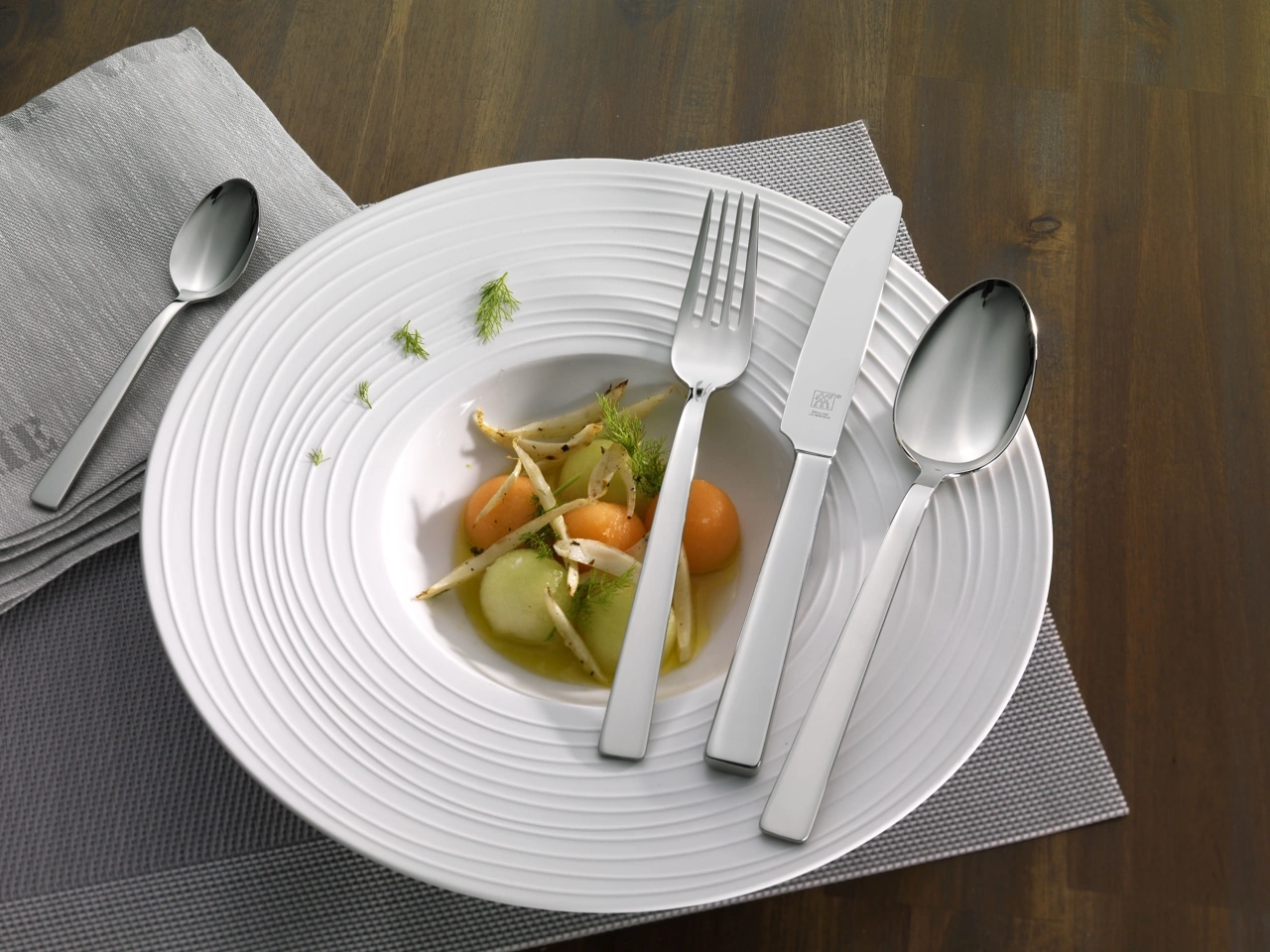 Die Stiel- und Heftenden aller Besteckteile sind vollständig poliert und haben abgerundete Kanten. Sie liegen besonders angenehm in der Hand. Das Besteck ist spülmaschinengeeignet und damit sehr pflegeleicht.