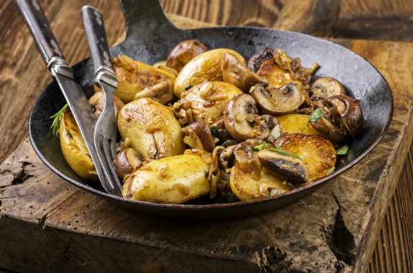 Kochgeschirr aus Schmiedeeisen, das über eine gut eingebrannte natürliche Oberflächenversiegelung verfügt, eignet sich für die Zubereitung von nahezu jedem Gericht, das kurz und kräftig angebraten werden muss. Rustikale Speisen, von Bratkartoffeln, über Steaks, bis hin zu Spiegeleiern, gelingen in diesen Pfannen ganz besonders gut. Solange die Pfanne noch nicht über eine ausreichende natürliche Beschichtung verfügt, sollte aber mit möglichst viel hitzebeständigem Öl gearbeitet werden.