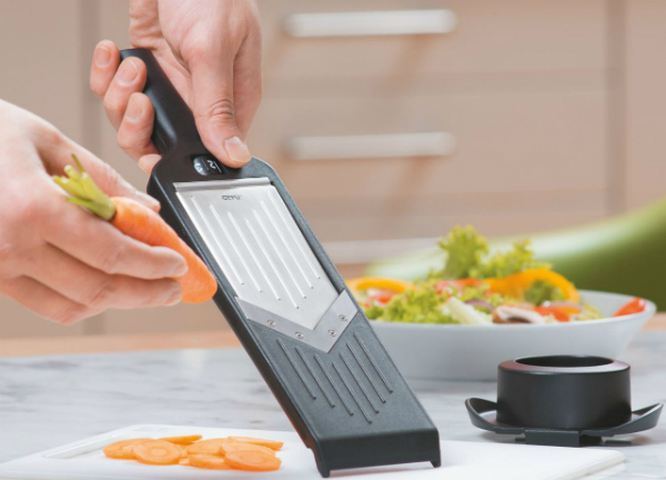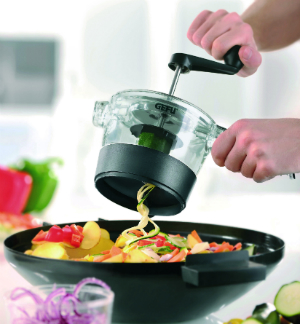 Das geht wunderbar schnell, sodass keine Tränen vergossen werden müssen. Nach dem Wenden in Mehl werden die Zwiebelspiralen kurz in heißem Fett frittiert und dann auf Küchenkrepp entfettet. So erhält man für Burger, Steaks oder Käsespätzle herrlich knusprige Zwiebeln. Das funktioniert übrigens auch mit Kartoffeln. Und wie attraktiv sieht eine Gemüse-Consommé aus, in der Sellerie, Möhre und Pastinake mit dem Spiralschneider geschnitten wurden? Wie wallende Locken schwimmen diese in der Suppe und machen Appetit. Hier greifen selbst Gemüsemuffel zweimal zu.