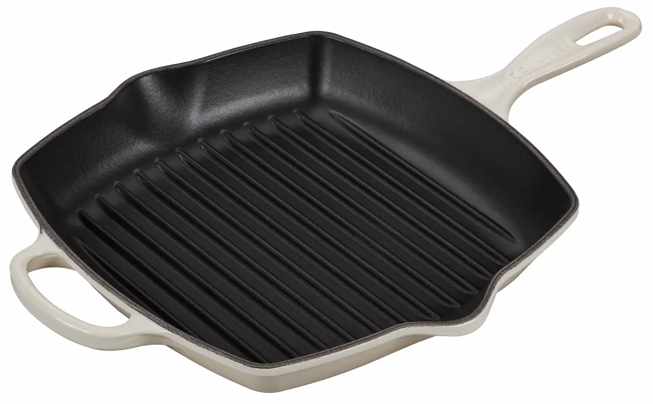 Im Gegensatz zu dem Produkt von Skeppshult besteht die rechteckige Le Creuset Grillpfanne aus emailliertem Gusseisen. Die Emaillierung ist dabei nicht nur enorm strapazierfähig und säurebeständig, sondern verträgt extrem hohe Hitze. Mit einer durchaus beachtlichen Bratfläche von 20 mal 36 Zentimetern ist die rechteckige Le Creuset Grillpfanne zudem groß genug, um mehrere Personen gleichzeitig zu bekochen.