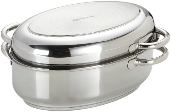 Sie haben nicht die guten Speichereigenschaften von gusseisernen Cocotten, dafür sehen Edelstahl Bräter unwahrscheinlich schön aus und sind sehr pflegeleicht. Da Edelstahl Hitze nicht gut leitet und auch nicht speichert, geschieht das nur über die angesetzte Bodenfläche, die für die Wärmeleitung sorgt. Dafür sind Edelstahl Bräter sehr leicht, bieten ein gutes Preis-Leistungs-Verhältnis und man erhält relativ günstig einen guten Brattopf, in dem das Gargut auf dem Herd wunderbar angebraten und dann ohne Umladen zum Schmoren in den Backofen gestellt werden kann.