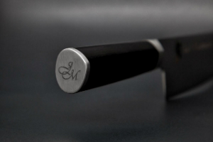 Die Schneide der Kai Shun Premier Tim Mälzer Messer wurde bis zum Ende des ergonomischen Griffes verlängert, also eine Fulltangkonstruktion. Der Griff ist aus dunklem Walnussholz gefertigt und bietet der Hand die Möglichkeit, die Klinge optimal zu führen. Ein schmückender Messingring bildet den Abschluss. Aufgrund der Symmetrie des Griffes kann das japanische Messer von Rechts- wie von Linkshändern gleichermaßen genutzt werden. Ein hübsches Detail ist das Mälzerlogo: der typische Küchenbulle in Tiefprägetechnik findet sich auf dem Griffende.