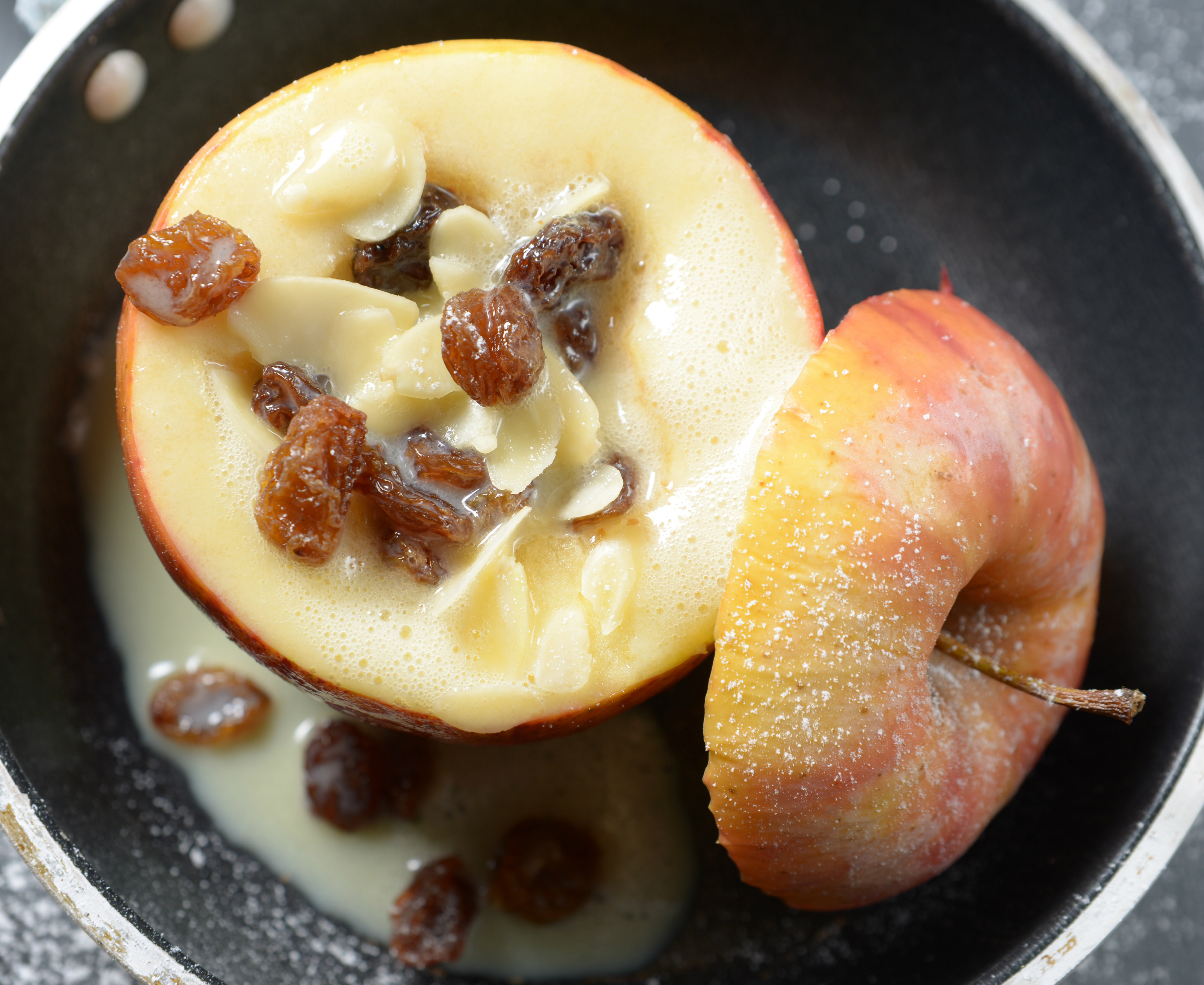 Die Äpfel etwas aushöhlen und mit Zitronensaft benetzen. Eine Auflaufform großzügig mit Butter einstreichen und die Früchte hineinstellen. Das kleingeschnittene Backmarzipan mit allen Zutaten außer dem Saft verkneten und in die Äpfel füllen. Mit Apfelsaft den Boden der Form gut bedecken und mit 200 °C Ober-/Unterhitze etwa 25 Minuten backen. Vanilleeis und Cantuccibrösel vervollständigen das Dessert.